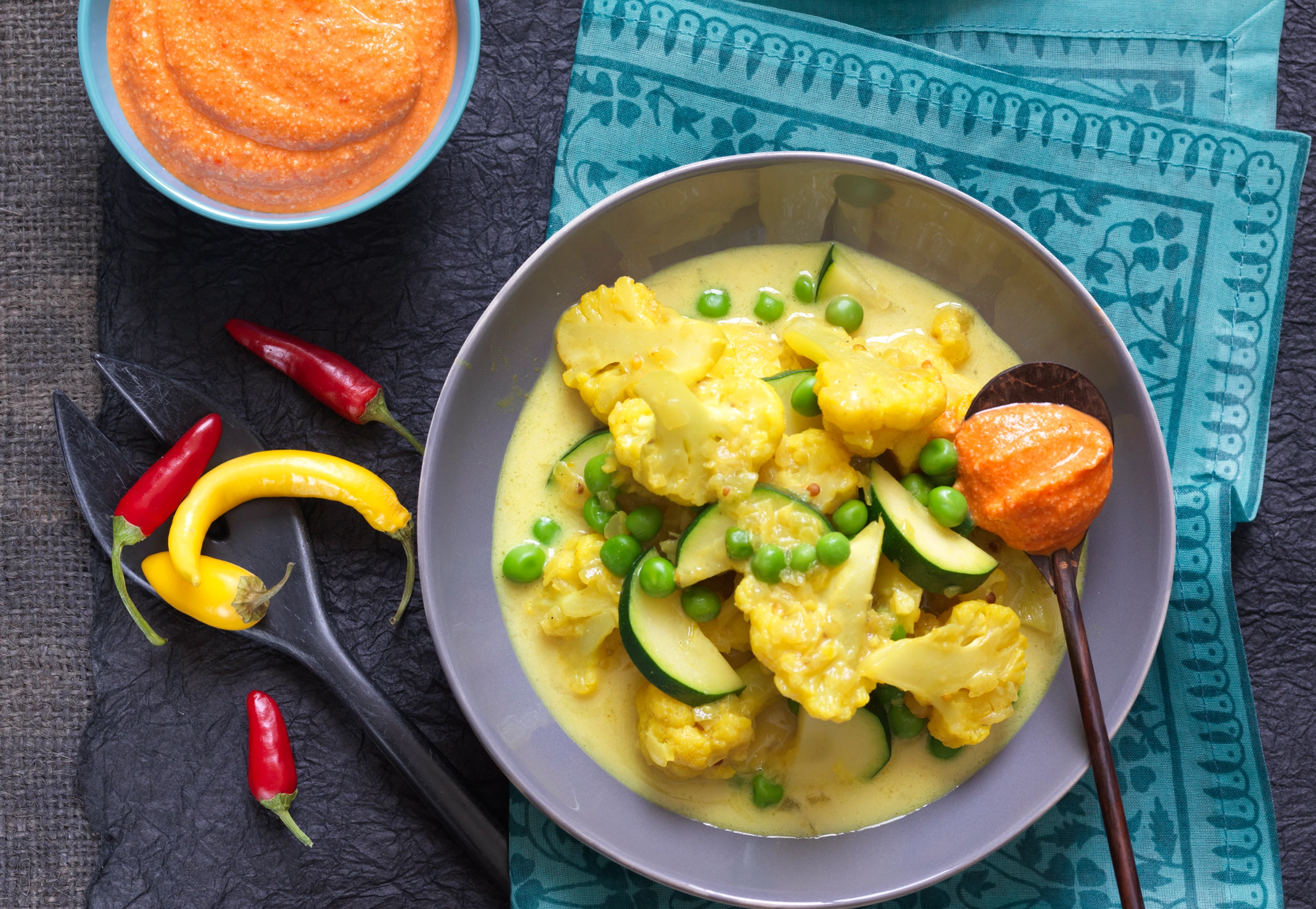 Paprika, Cashews, Zitronensaft und Koriander mit dem Mixstab zu einer Sauce pürieren, mit Salz abschmecken. Curry mit Paprika-Cashew-Sauce anrichten. Dazu passt Couscous.