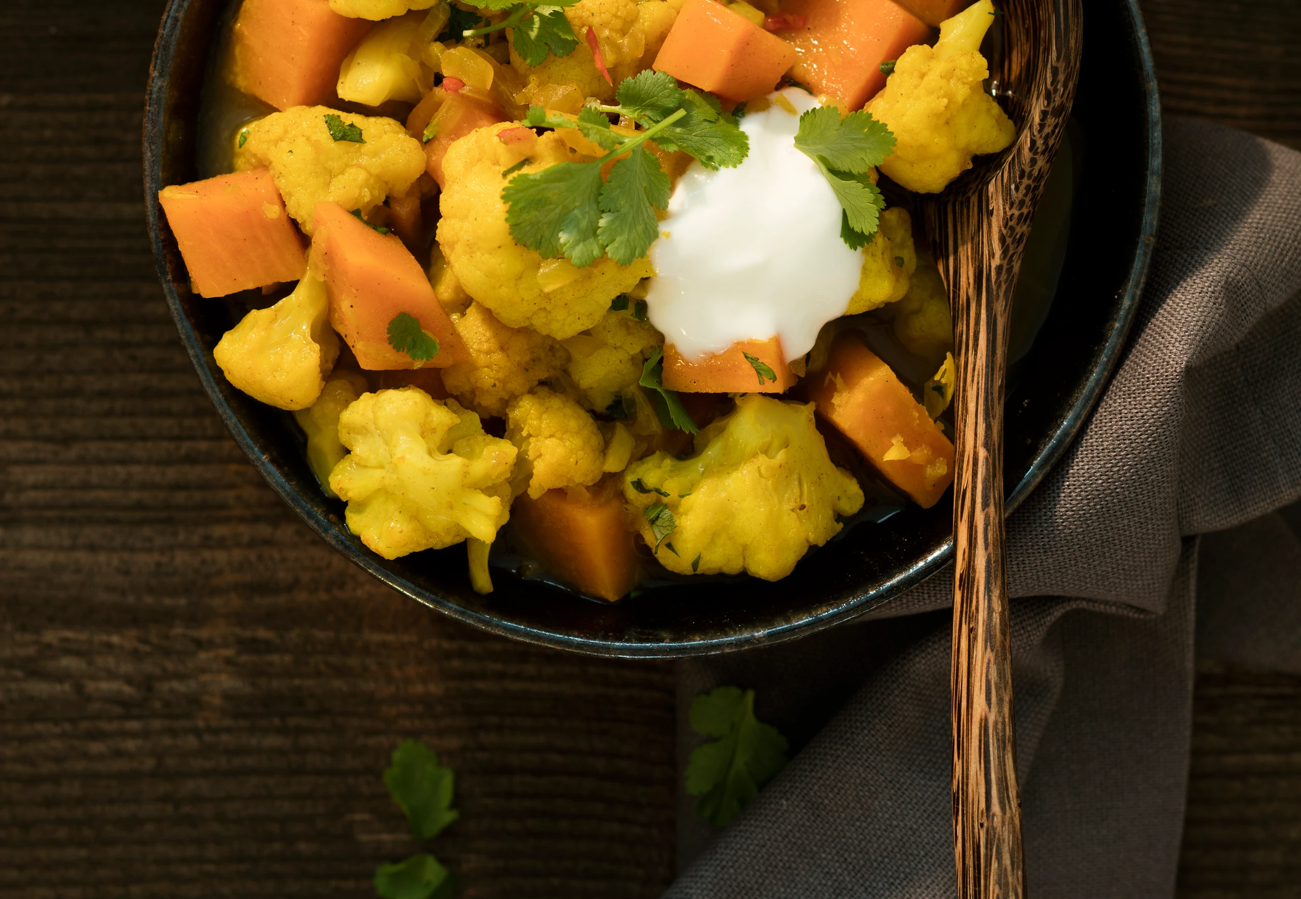 Curry anrichten, mit Joghurt garnieren und mit gehacktem Koriander bestreuen. Dazu passt Mango-Chutney.