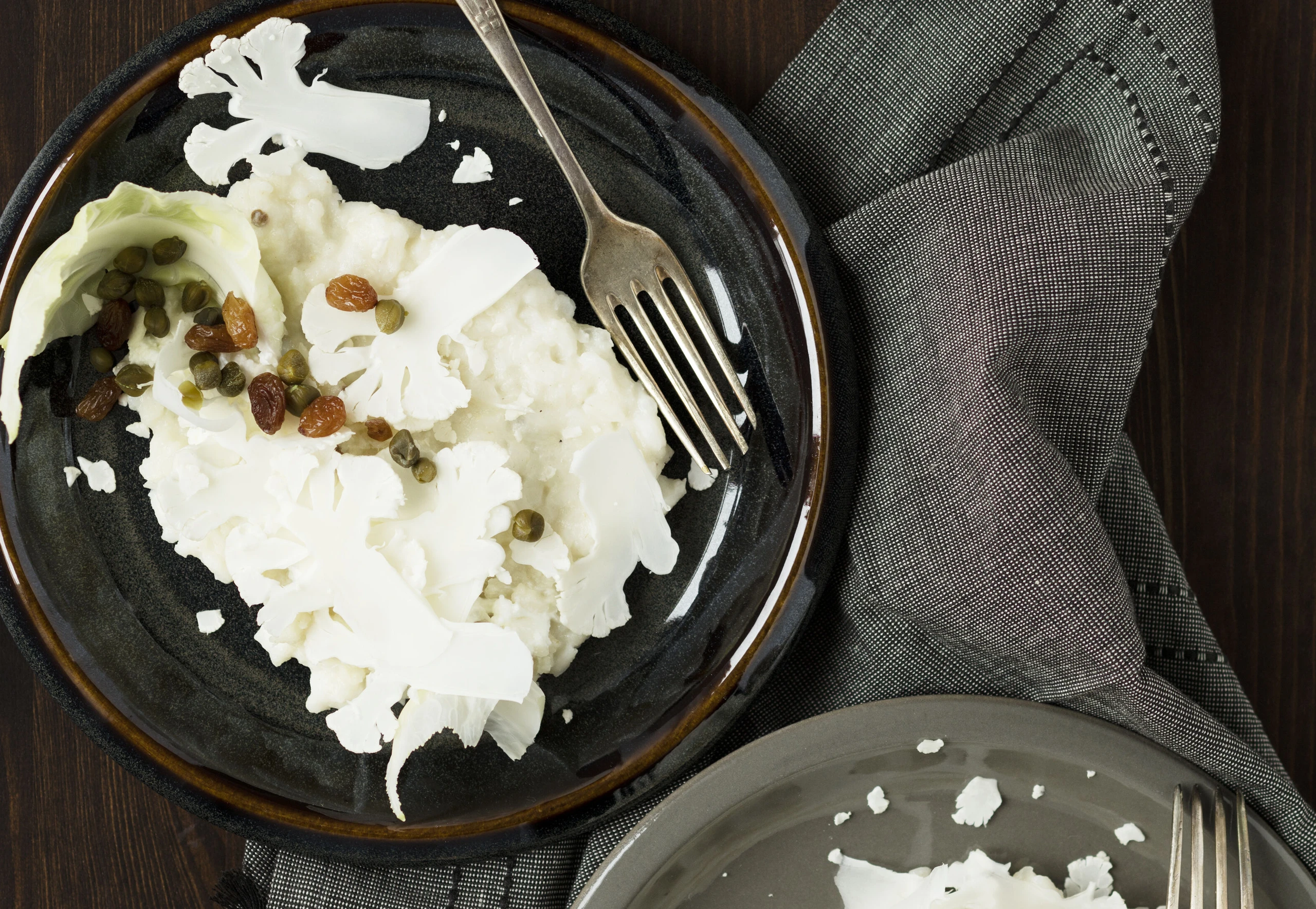Kapern mit Rosinen und Apfelessig mischen. Karfiolcreme in das Risotto rühren. Risotto mit je 1 EL Ziegenfrischkäse und Kapern-Rosinen-Mischung anrichten. Zuletzt übrigen rohen Karfiol fein darüber hobeln.