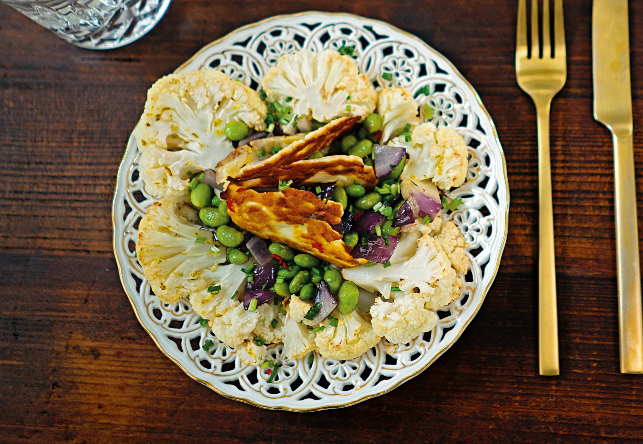 Karfiolsteaks mit Sojabohnen und Halloumi
