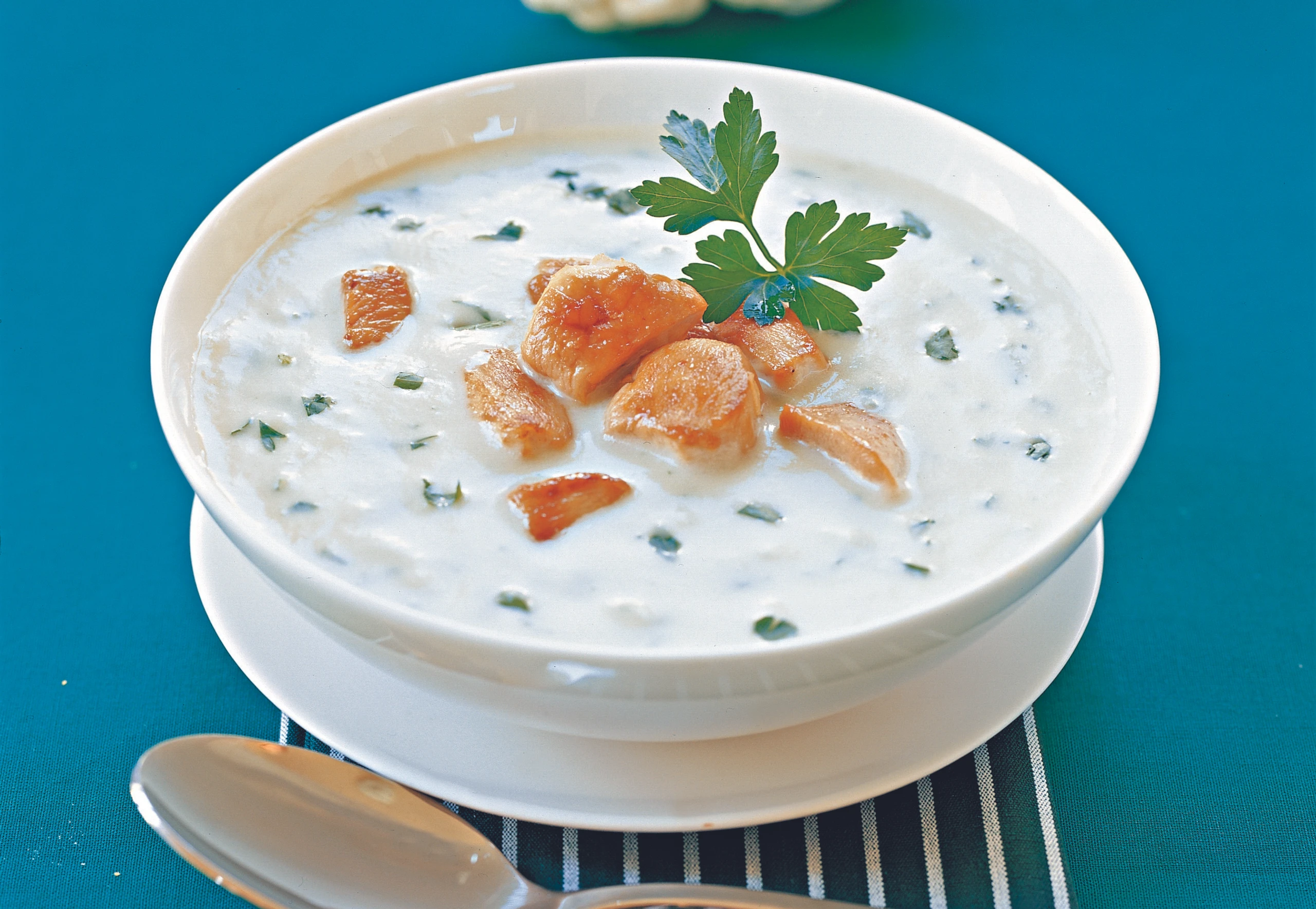 Im Bratrückstand Zwiebel und Karfiol anrösten, Suppe und Obers zugießen. Suppe ca. 12 Minuten köcheln, pürieren, salzen und pfeffern. Fleisch und Petersilie einrühren und kurz ziehen lassen.
