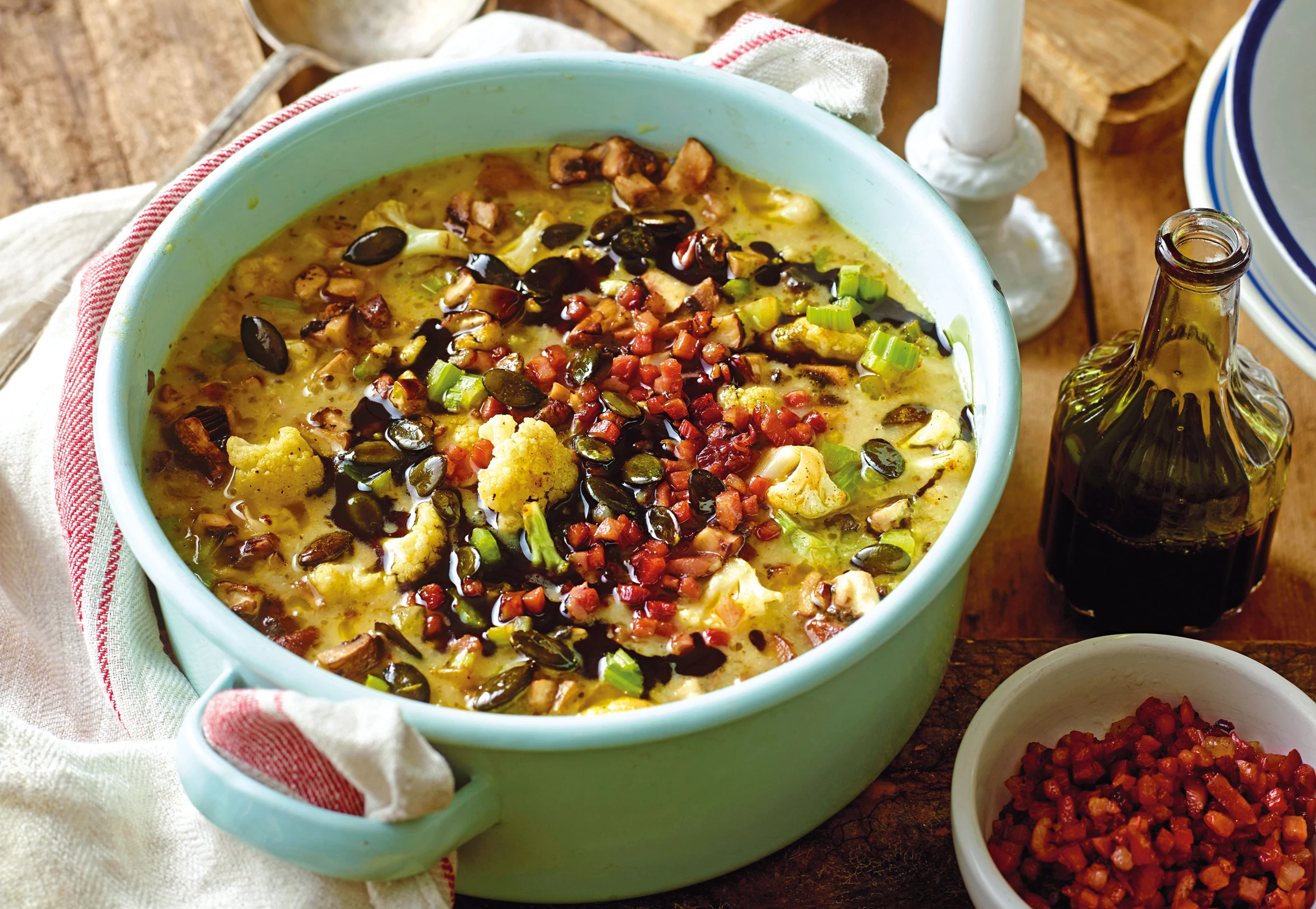 Übrigen Karfiol und die Gemüse-Speckmischung in die Suppe rühren und kurz köcheln. Suppe anrichten und mit Kürbiskernöl beträufeln.
