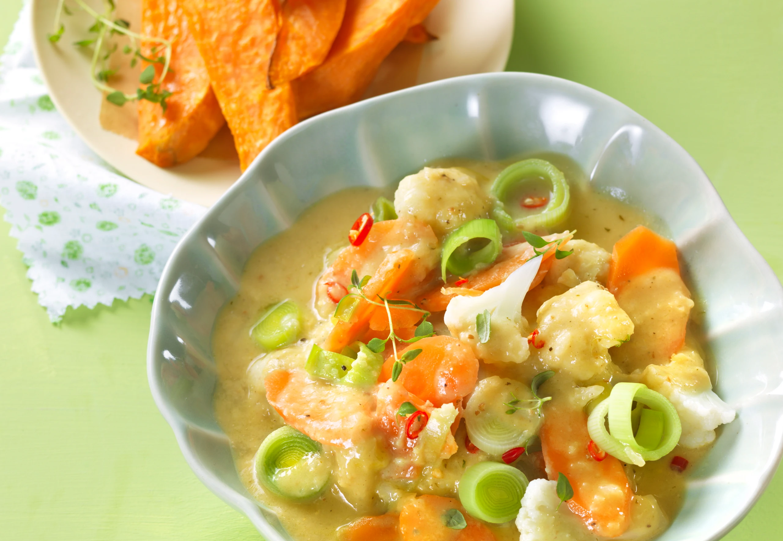 Karibischer Gemüsetopf mit Süßkartoffel-Wedges