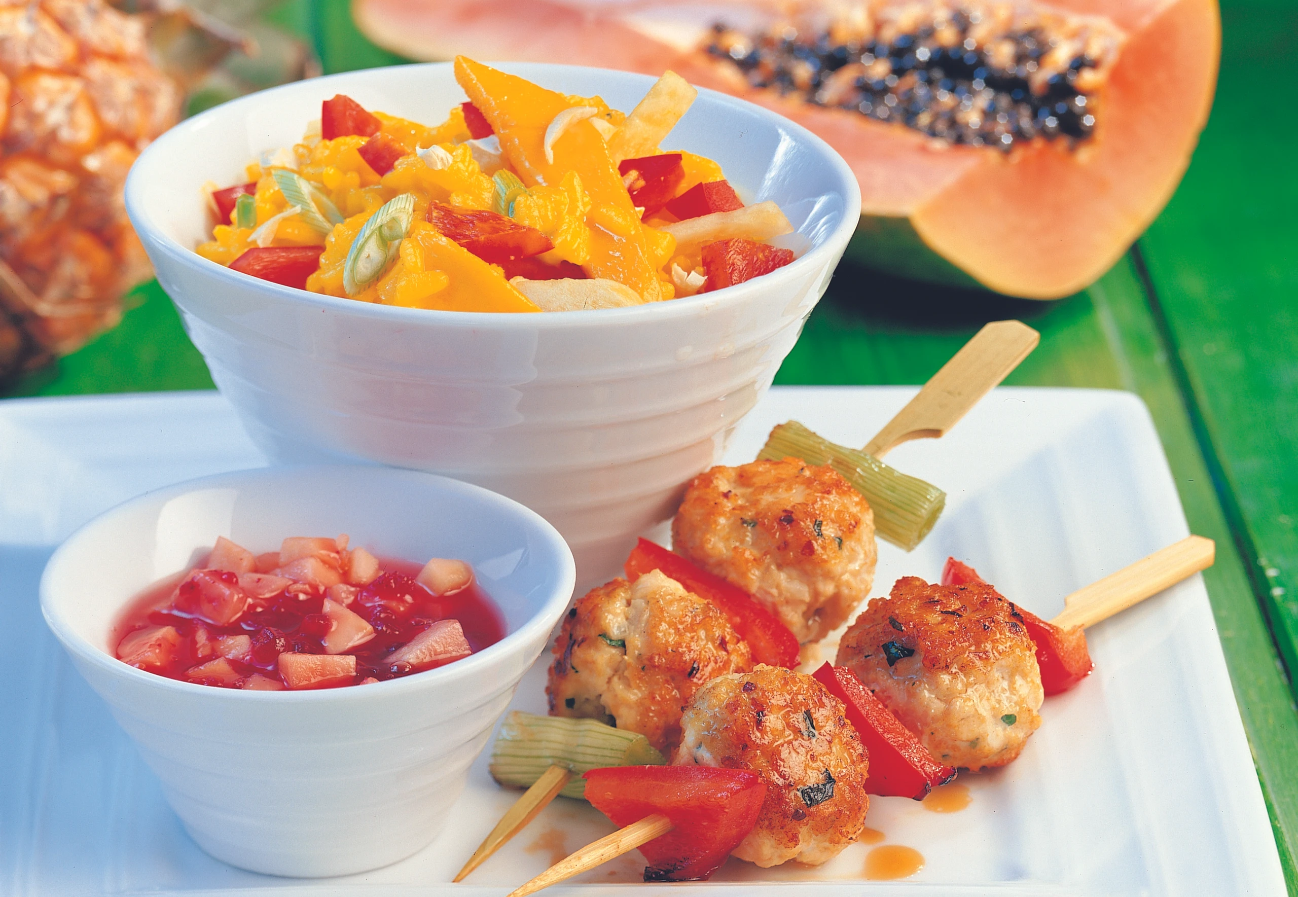 Früchte schälen, Gemüse putzen. Mango in Scheibchen, Ananas in Stifte, Jungzwiebeln in Ringe schneiden. Paprika klein würfeln. Cashews hacken. Reis, Früchte, Gemüse und Cashews vermischen, mit Spießen und Salsa servieren.