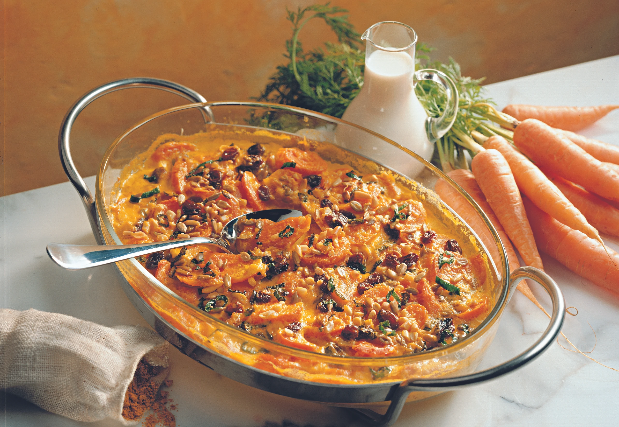 Sauce aufkochen, salzen, pfeffern und über die Karotten gießen. Gemüse mit Rosinen, Mandeln, Sonnenblumenkernen, Zwiebelringen und zuletzt mit Käse bestreuen.