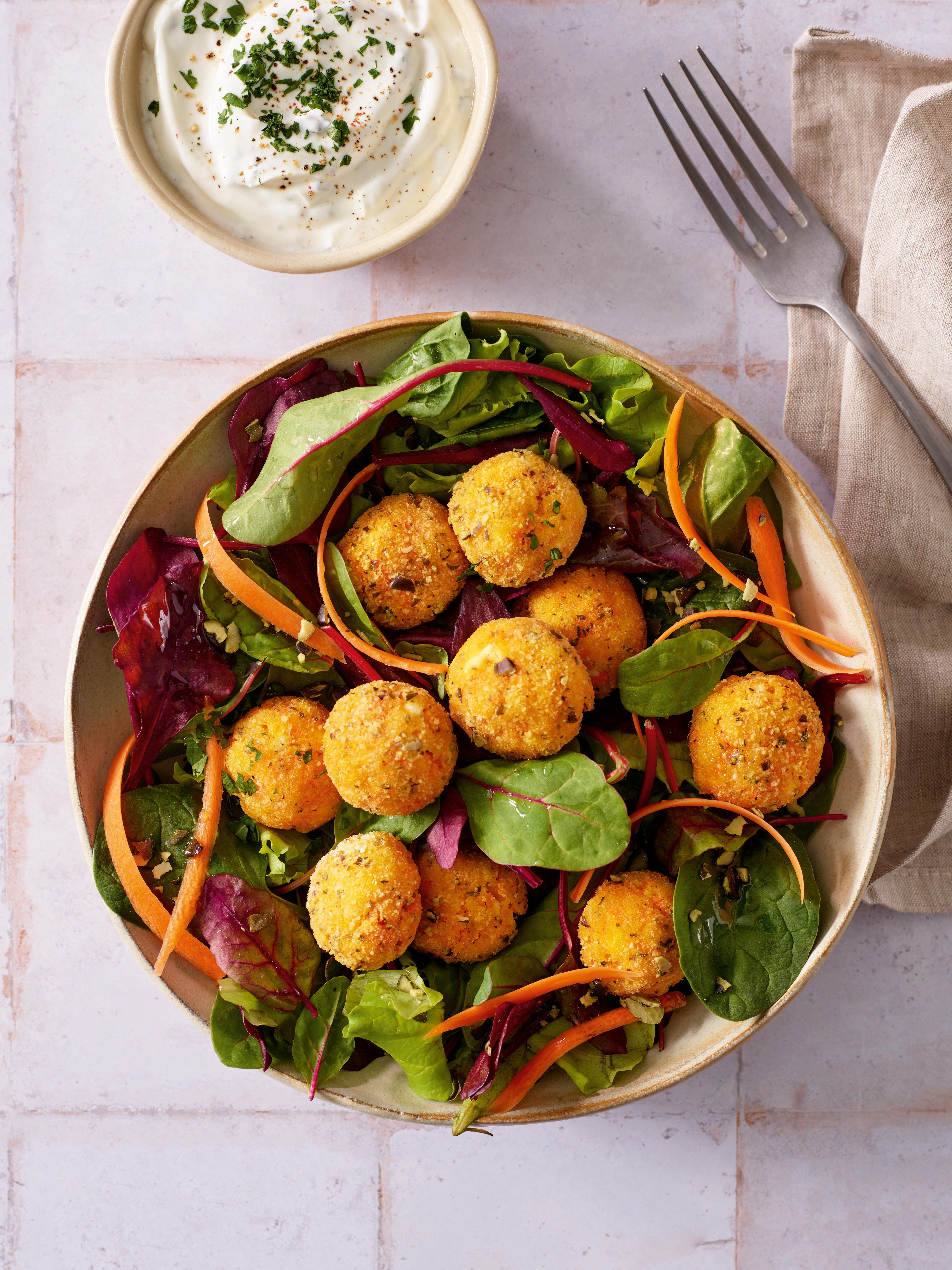 Für die Bällchen Karotten schälen, raspeln und mit den restlichen Zutaten mischen, sodass eine homogene Masse entsteht. Mit einem Teelöffel etwas Masse abstechen, ein kleines Bällchen formen. Vorgang mit restlicher Masse wiederholen.