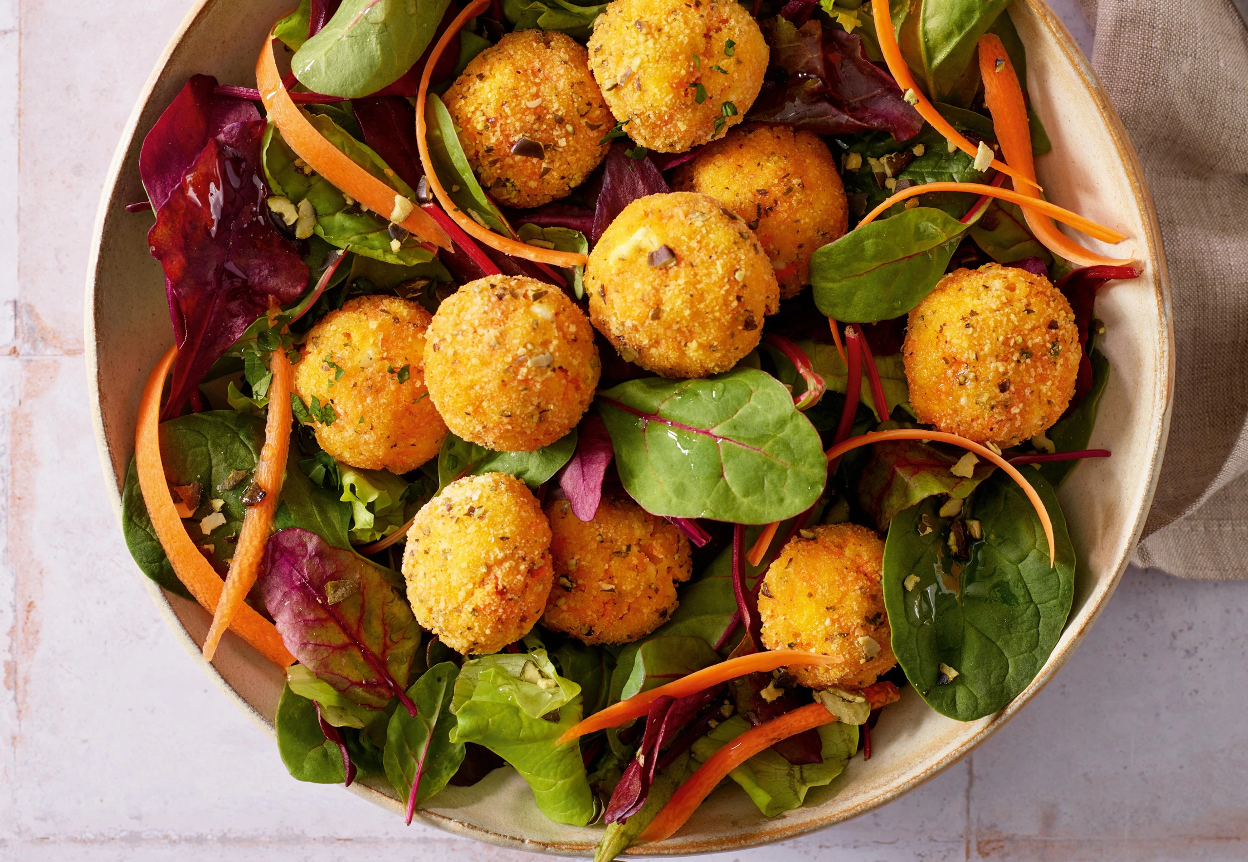 Für die Panade Brösel mit Kürbiskernen mischen. Bällchen in der Panade wälzen, auf die Bleche legen, mit etwas Öl betupfen und im Rohr (mittlere Schiene) ca. 15 Minuten goldbraun backen.