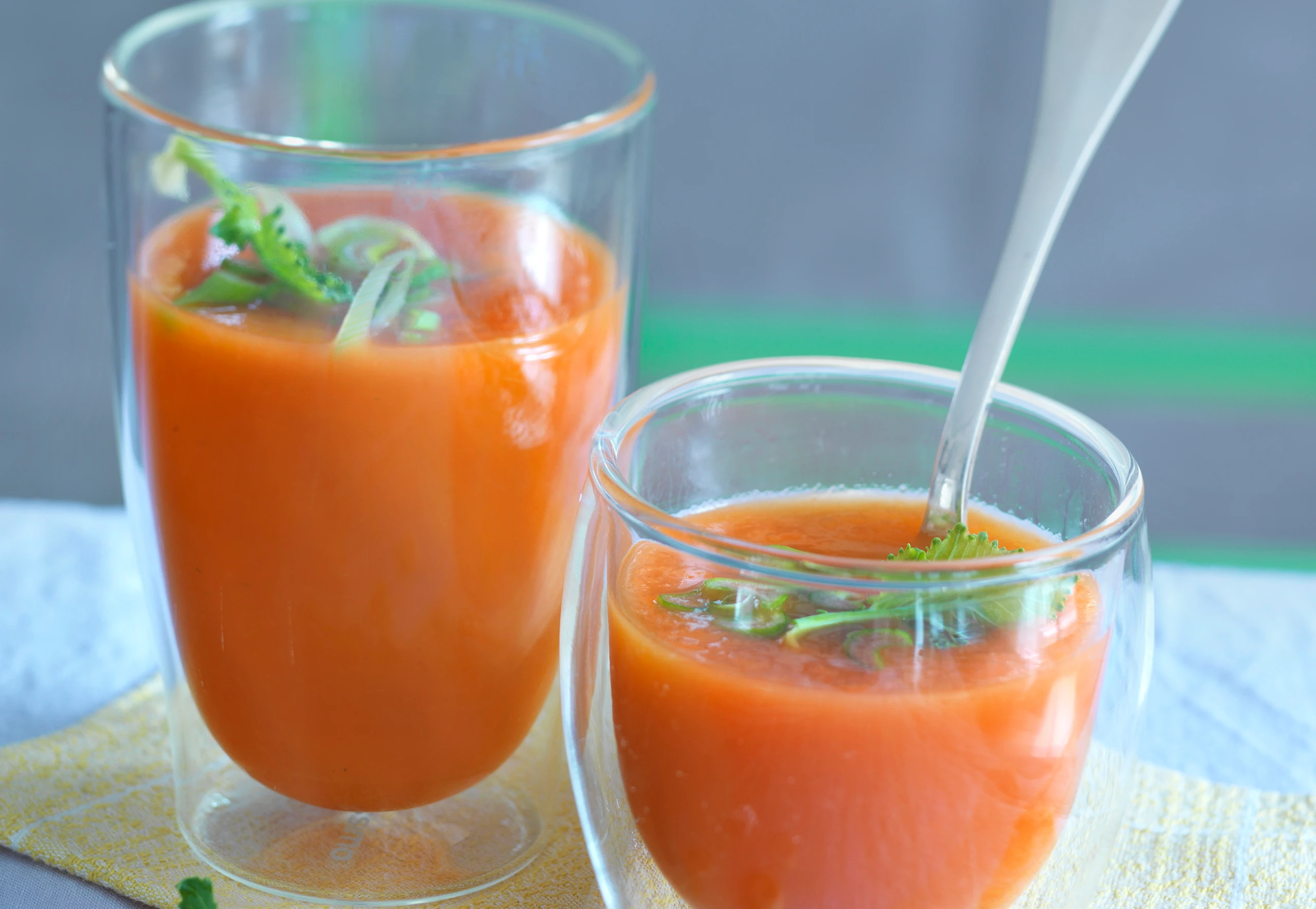 - Suppe mit dem Stabmixer fein pürieren, mit Zitronensaft, Salz und Pfeffer abschmecken, mit Jungzwiebeln bestreut servieren.