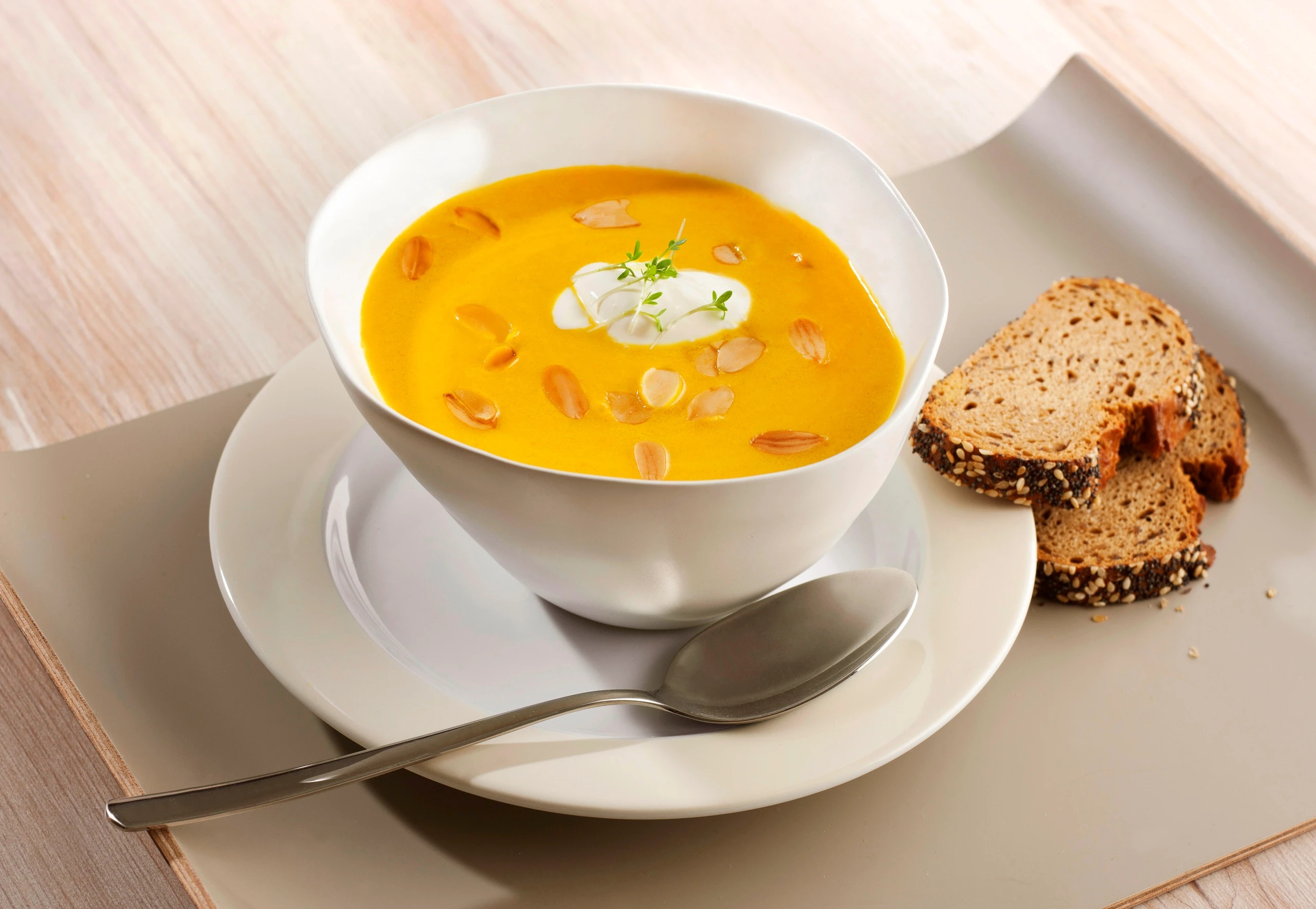 Suppe mit dem Stabmixer pürieren und mit Limettensaft verfeinern. Suppe anrichten und mit Mandelblättchen, Crème fraîche und Kresse garniert servieren.