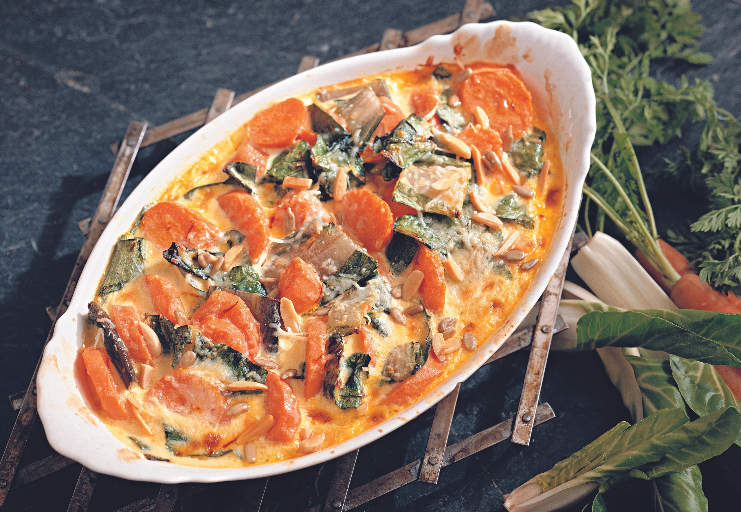 Suppe mit Obers und Safran verrühren, aufkochen, salzen, pfeffern und über das Gemüse gießen. Gemüse mit Mandeln, Sonnenblumenkernen und Käse bestreuen, mit übriger Butter belegen und im Rohr (mittlere Schiene / Gitterrost) ca. 45 Minuten backen.