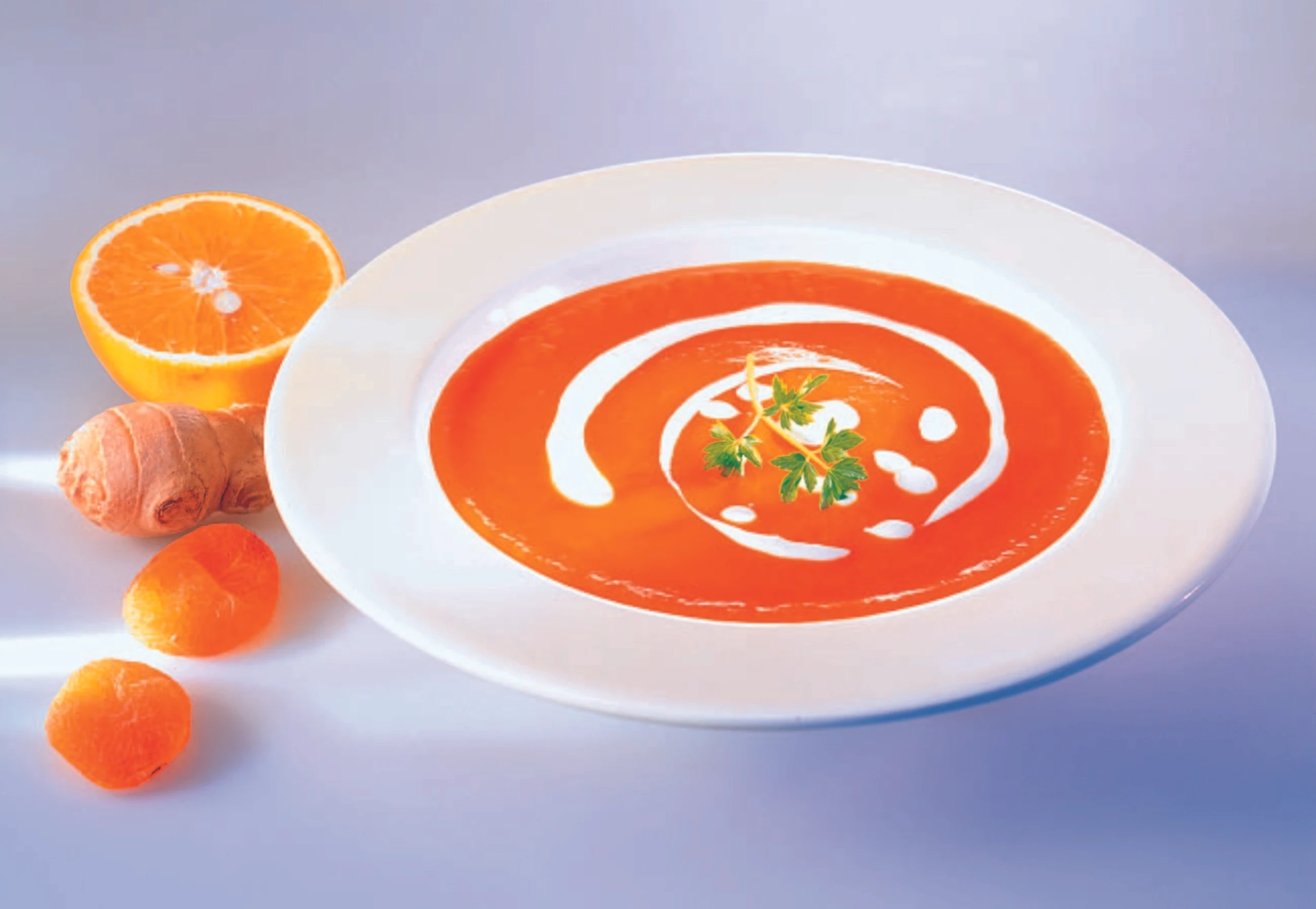 - Suppe zugießen und aufkochen. Karotten, Marillen, Ingwer und abgeriebene Orangen- oder Zitronenschale zugeben und bei mittlerer Hitze weich kochen (dauert ca. 8 Minuten). Suppe fein pürieren, mit Orangensaft verfeinern und mit Salz und übrigem Chili würzen.