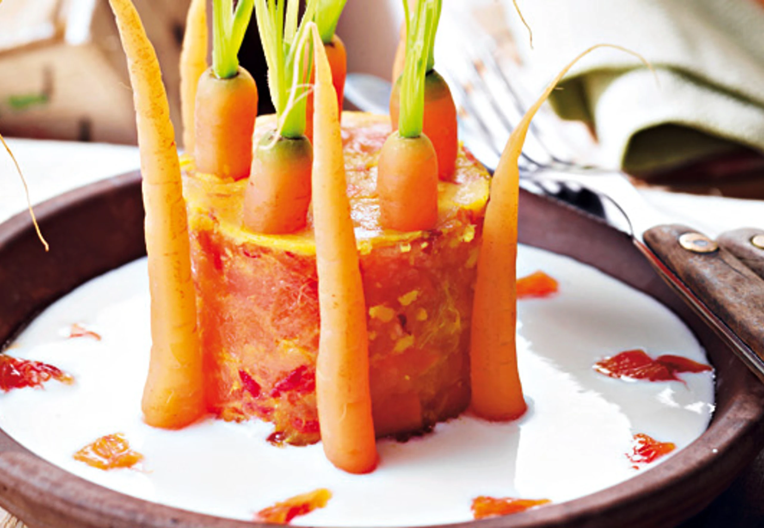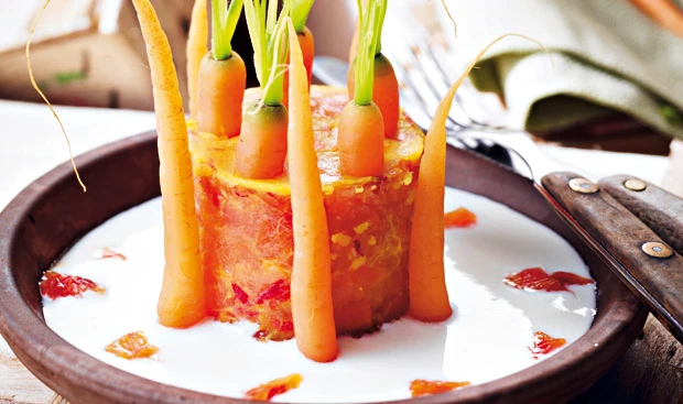 Förmchen kurz in heißes Wasser tauchen, Gelees stürzen, mit den jungen Karotten und Joghurt anrichten.