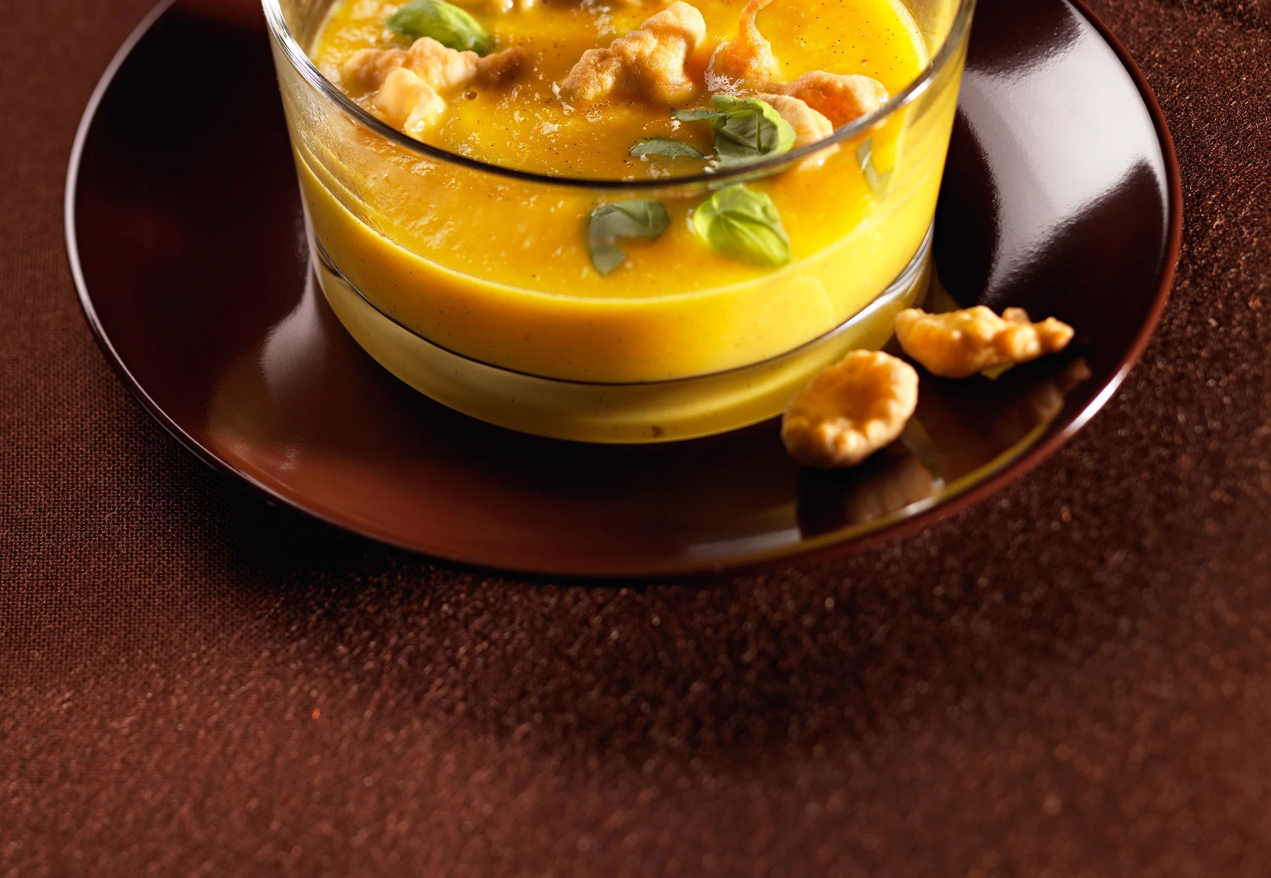 - Orangenschale und -saft zugeben, ein wenig einkochen lassen und mit Gemüsesuppe aufgießen. Suppe ca. 5 Minuten kochen, Sauerrahm einrühren. Suppe mit einem Stabmixer pürieren.