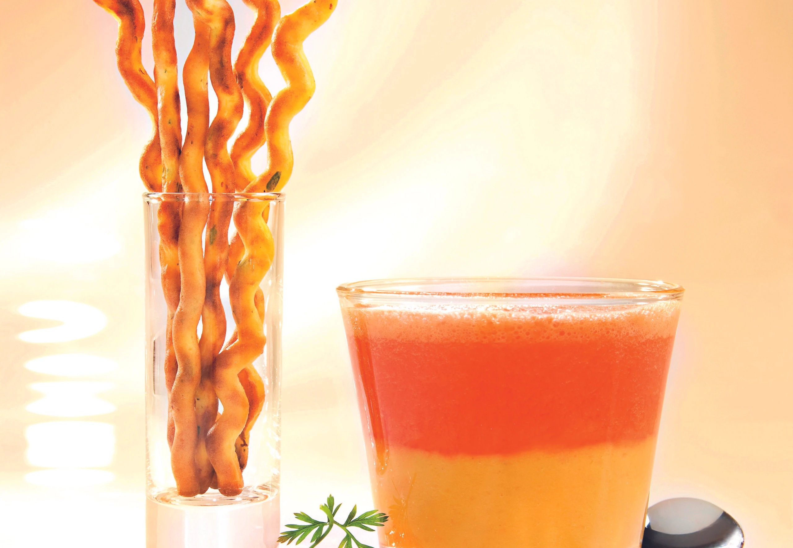 Obers cremig schlagen, Karottensuppe damit verrühren. Paprikasuppe schaumig aufmixen. Karottencreme in Gläser füllen, Paprikaschaumsuppe darauf gießen.