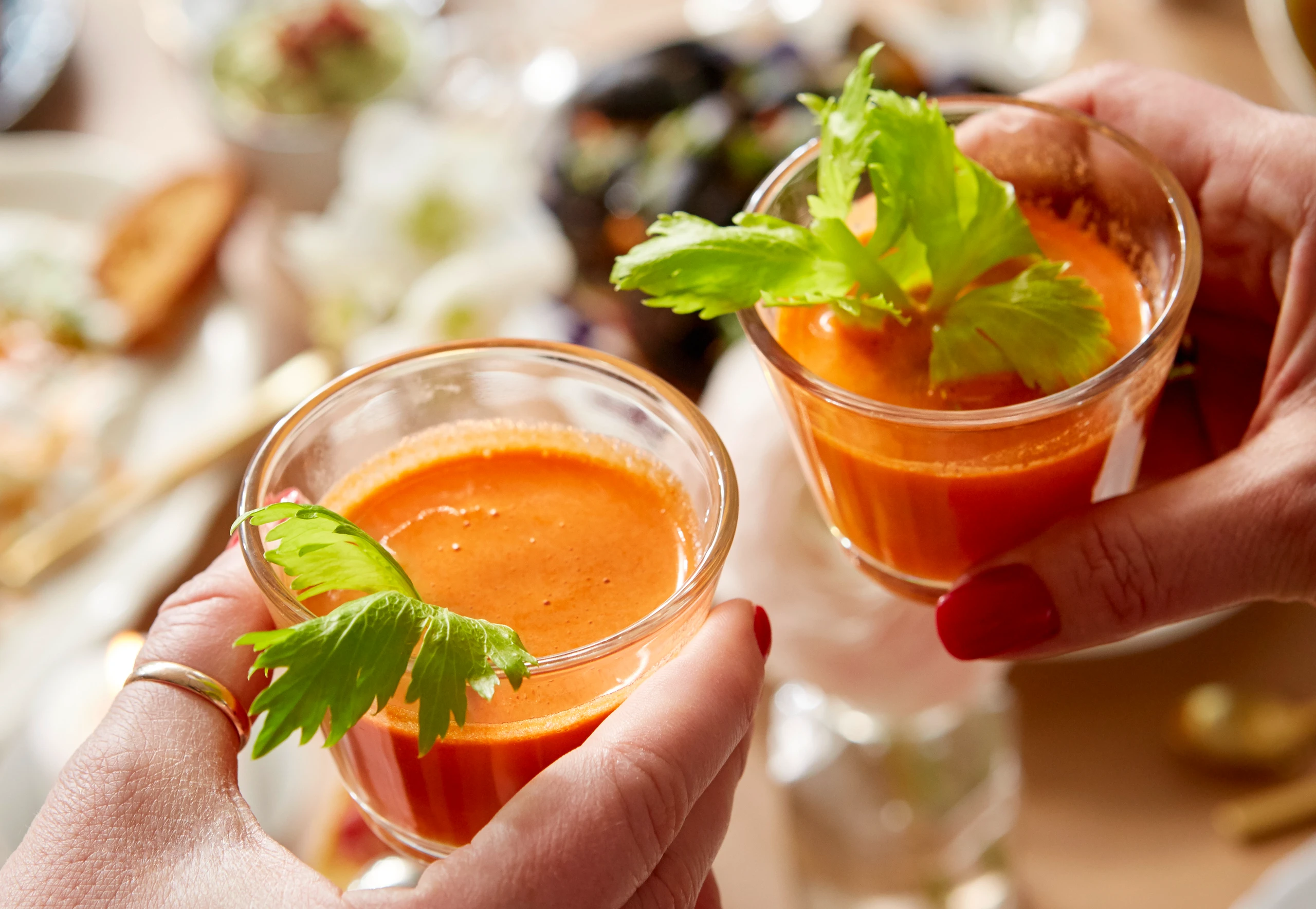 Shots mit dem Stabmixer aufschlagen, in Gläser (Inhalt ca. 150 ml) füllen und mit Stangensellerie garnieren.