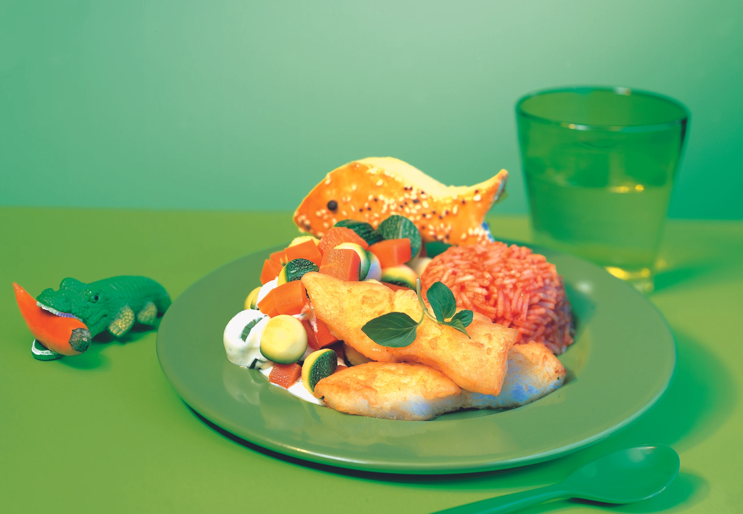 Gemüse mit der Sauce, Fisch und Reis anrichten und eventuell zusätzlich mit Fischen aus Knusperteig garnieren.