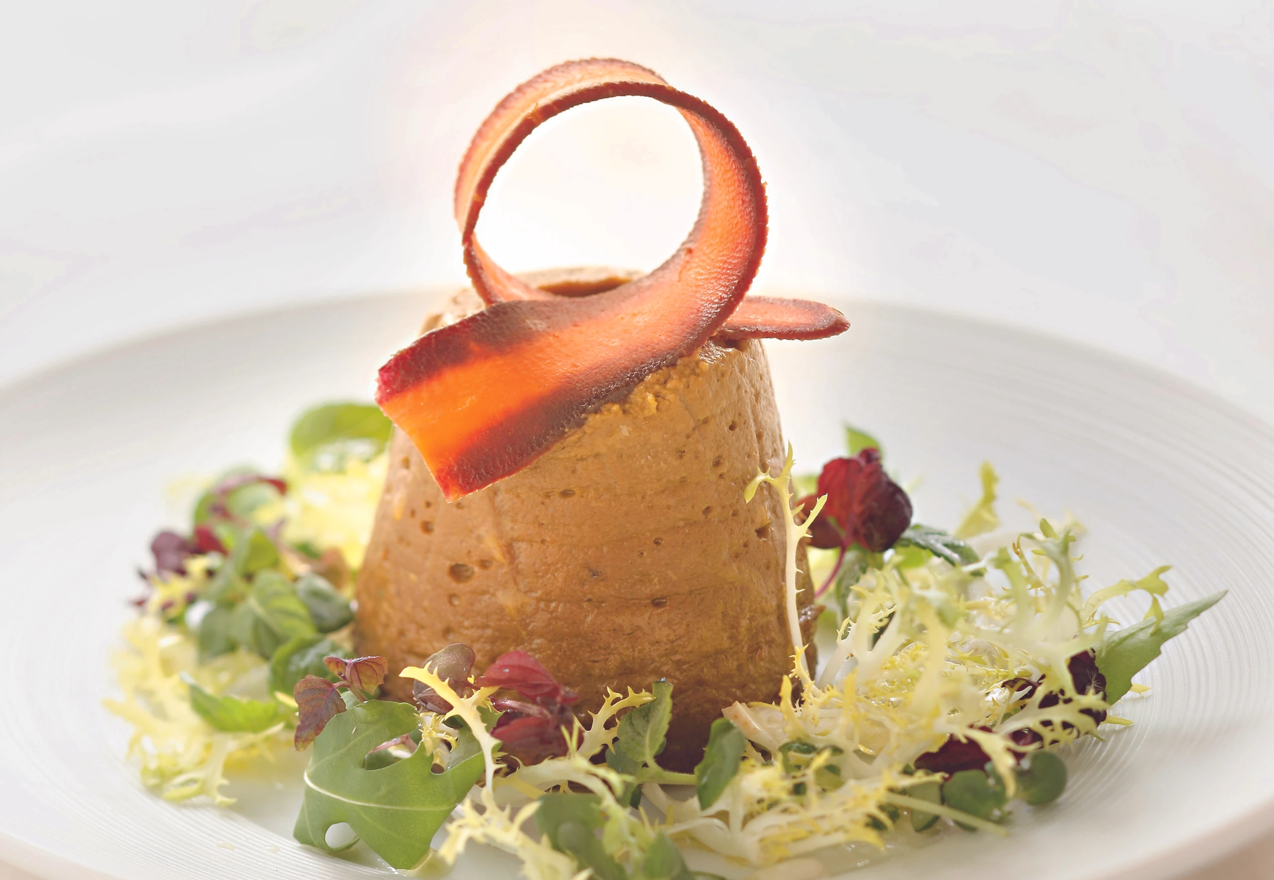 Karottenstreifen in aufgeschäumter Butter beidseitig anschwitzen. Flans aus den Förmchen stürzen, mit Salat anrichten, mit den Karottenstreifen garniert servieren.