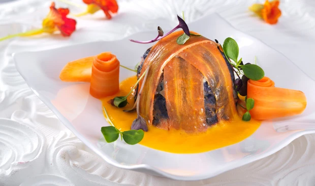 Rohr auf 160°C vorheizen. Auflaufförmchen (Inhalt 150 ml) mit Butter ausstreichen. Mittlere Karotten schälen und 20 dünne Längsscheiben abziehen. Scheiben in Salzwasser kurz überkochen, abseihen, abschrecken und mit Küchenpapier trockentupfen.