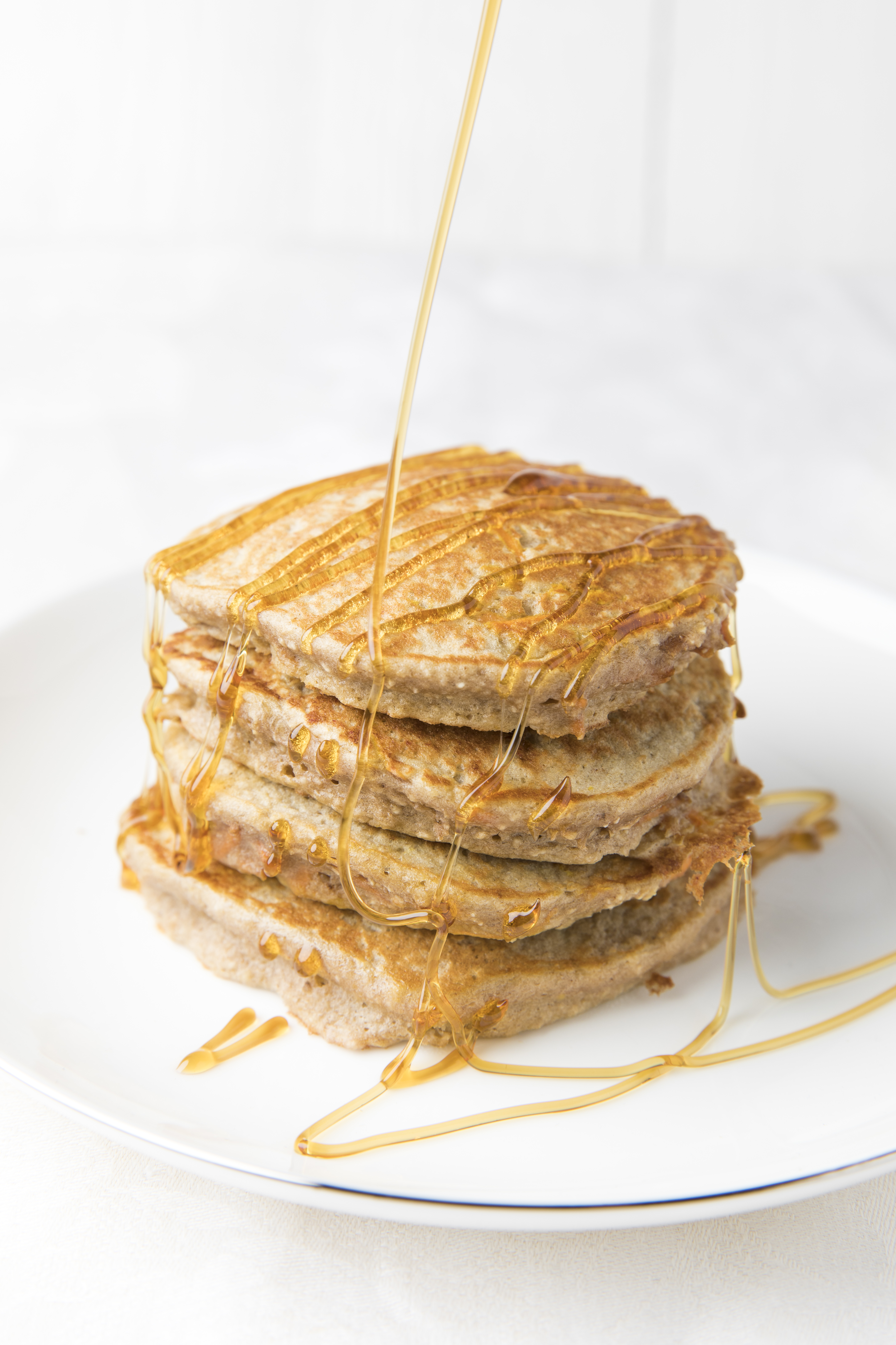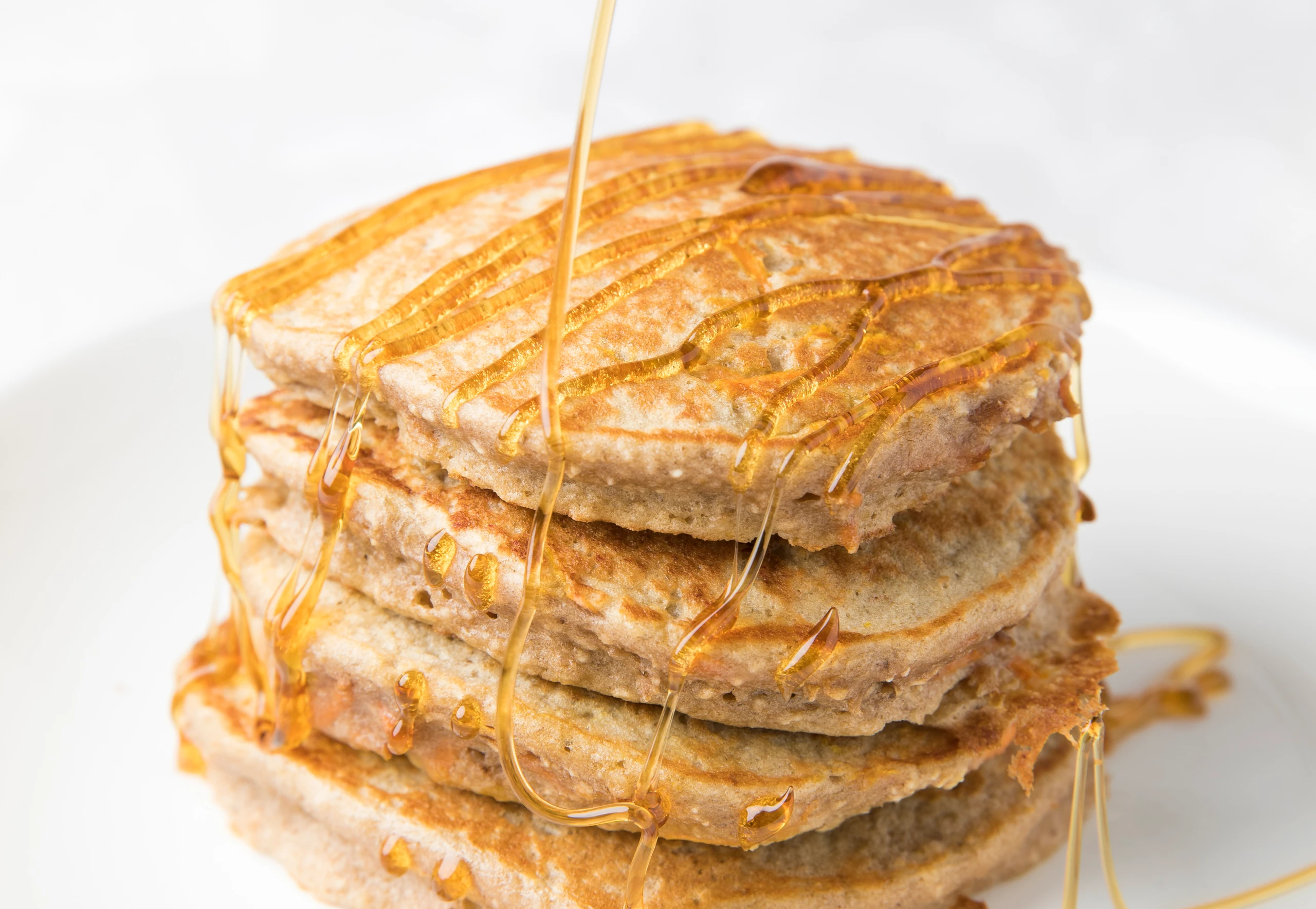 Eine beschichtete Pfanne mit wenig Öl bestreichen. 2 EL Masse pro Pancake in der Pfanne verteilen und bei mittlerer Hitze beidseitig goldbraun backen. Pancakes herausnehmen und mit Honig beträufeln.