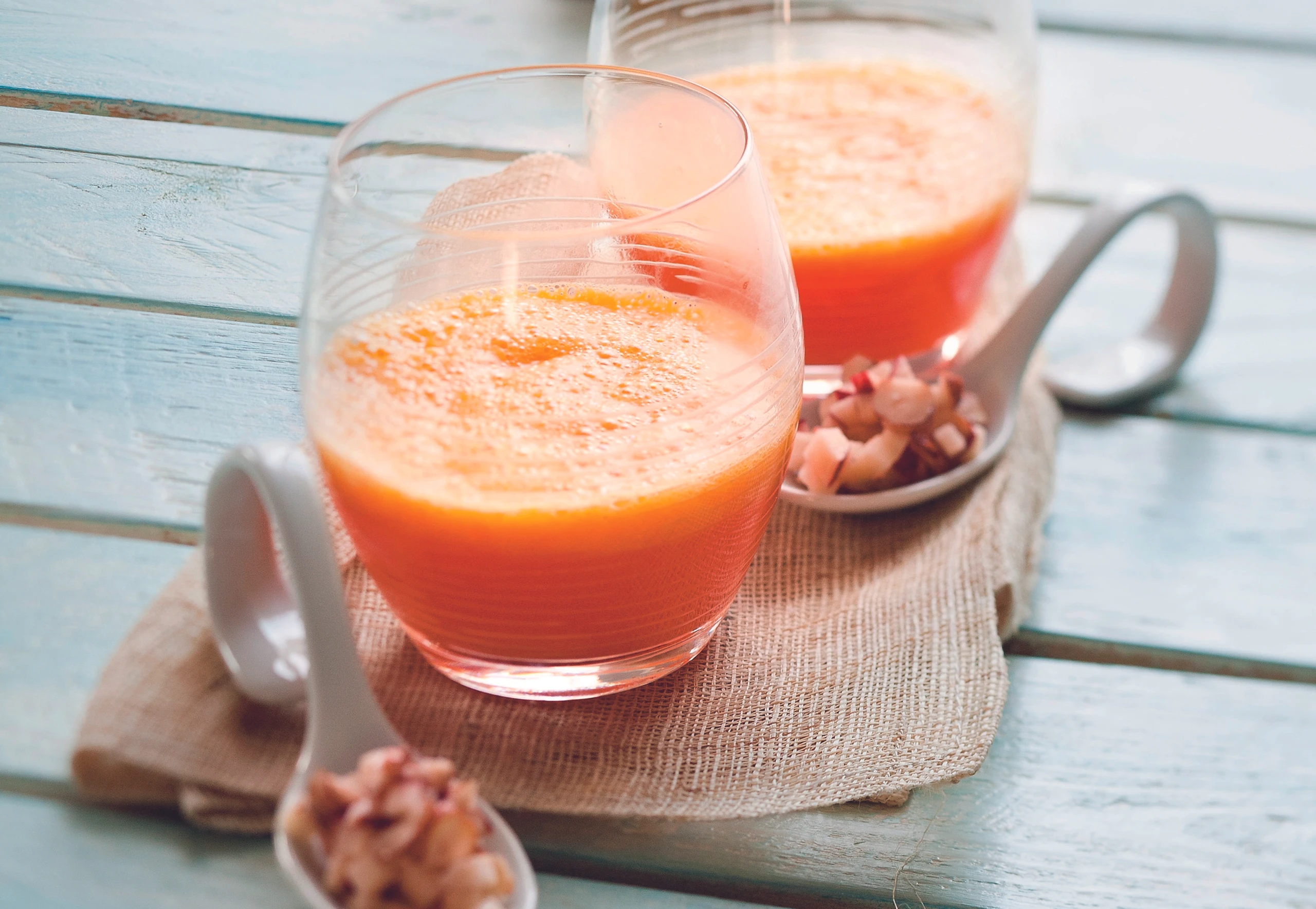 Sieb mit einem Tuch auslegen und über einen Topf hängen. Suppe pürieren und so viel davon durch das Sieb gießen, dass 600 ml orangeklare Flüssigkeit im Topf ist.
