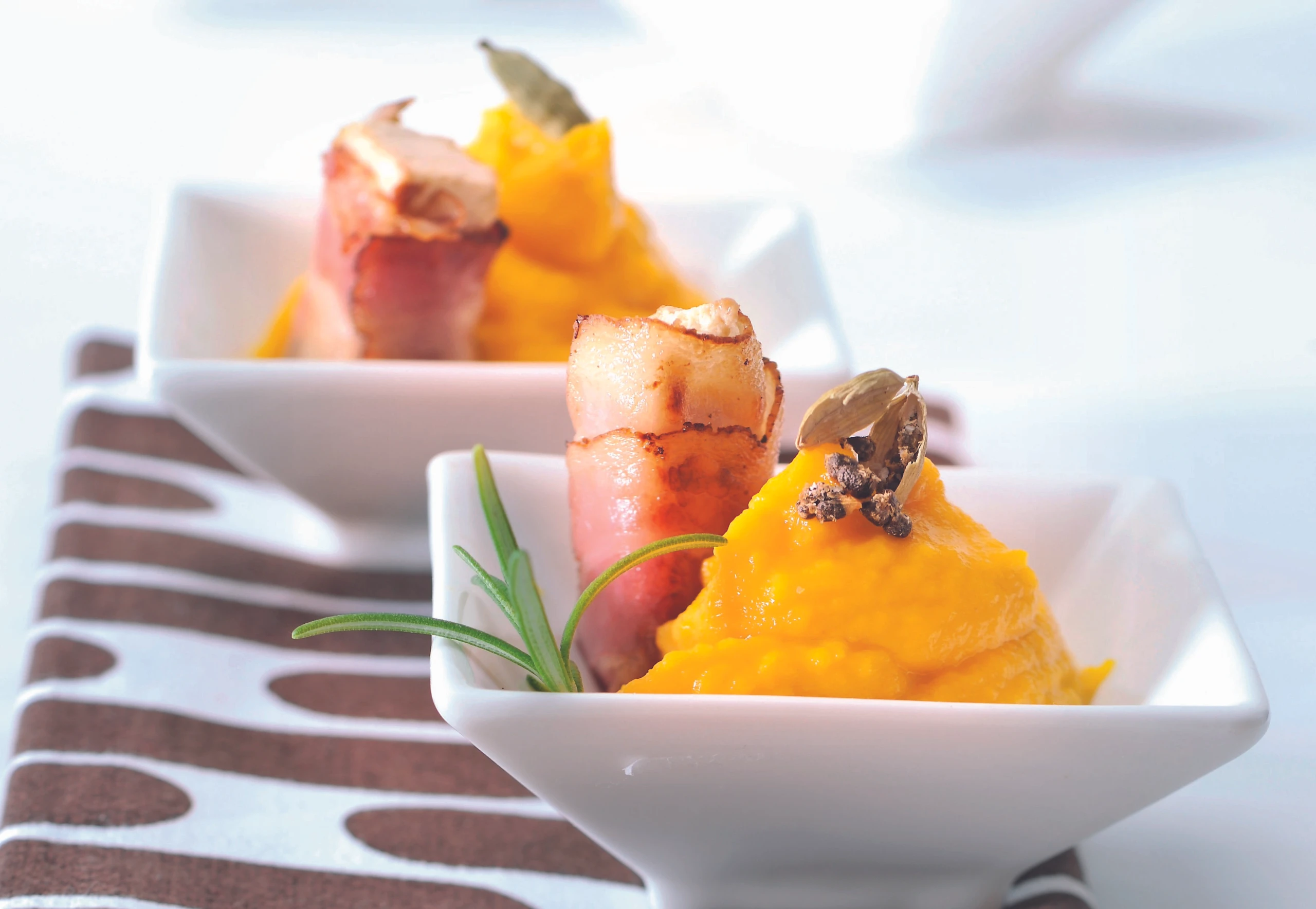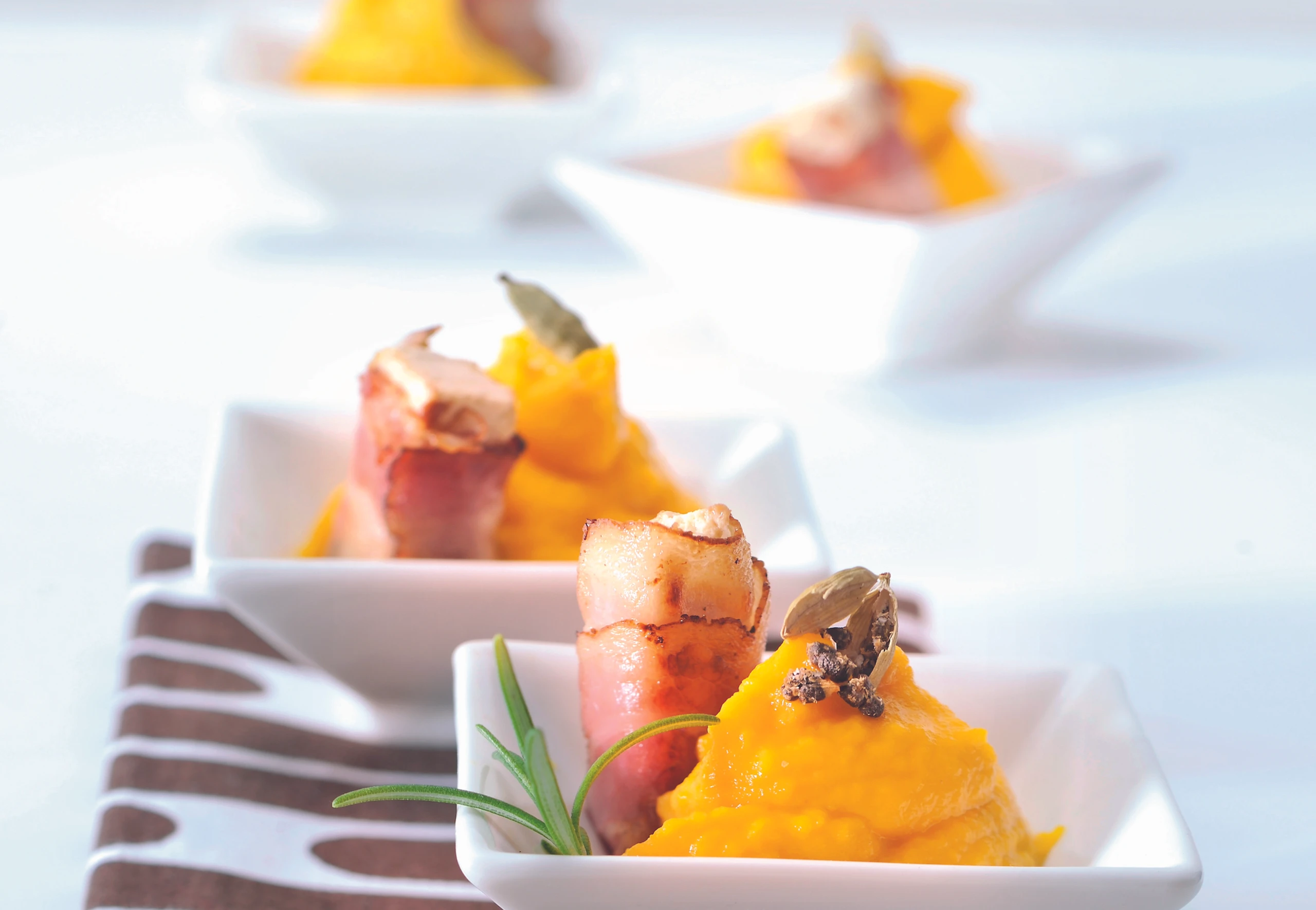 - Tofu in kleine Streifen schneiden, fest mit Speck umwickeln und in einer beschichteten Pfanne bei mittlerer Hitze knusprig braten. Püree mit Specktofu anrichten und evtl. mit Kardamom garnieren.