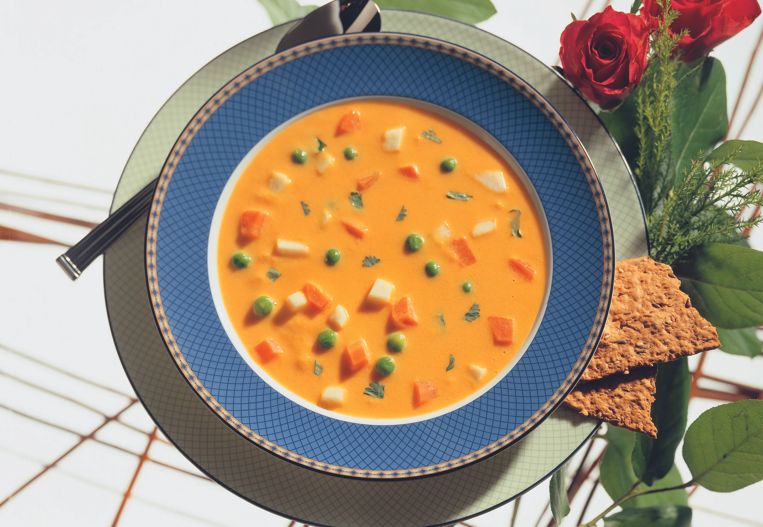 Suppe mit einem Stabmixer fein pürieren und mit Salz und Pfeffer würzen. Erbsen, dann Karotten- und Apfelstücke untermischen und kurz erwärmen. Suppe in Teller schöpfen und mit Koriander bestreut rasch servieren. Dazu reicht man Knäckebrot.
