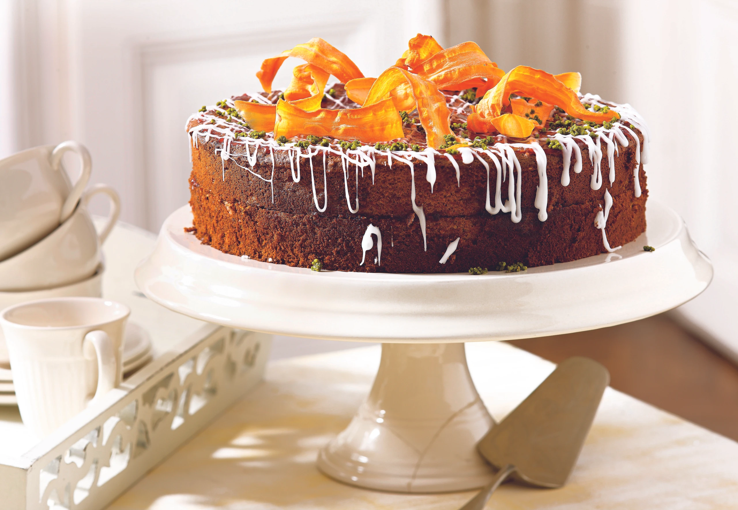 Für die Glasur Zucker mit Wasser und Zitronensaft glatt rühren. Torte streifenförmig damit verzieren, mit Pistazien und Karottenchips garnieren.