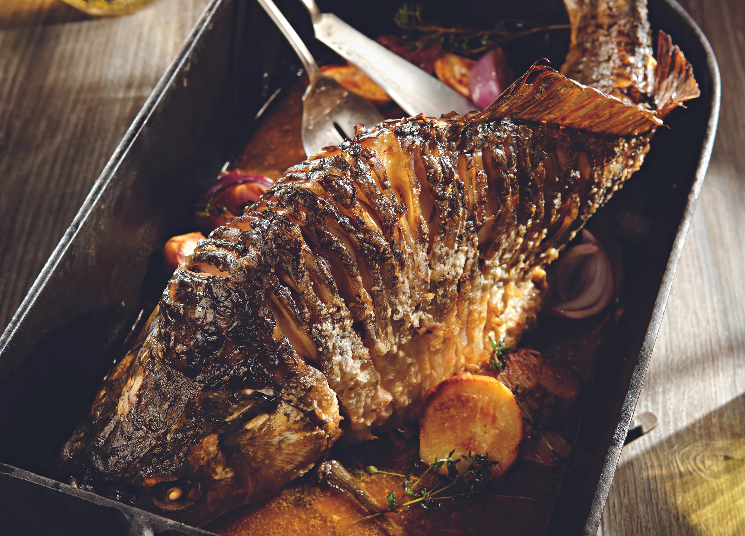 Rohr auf 200°C vorheizen. Bratenpfanne vorbereiten. Gemüse schälen. Zwiebel in Spalten, übriges Gemüse in 2 cm dicke Scheiben schneiden. Karpfen in die Pfanne setzen (siehe Fotofolge) und mit 6 EL Öl übergießen. Gemüse zugeben und den Karpfen im Rohr (unterste Schiene / Gitterrost) ca. 50 Minuten braten; nach halber Garzeit Suppe zugießen.