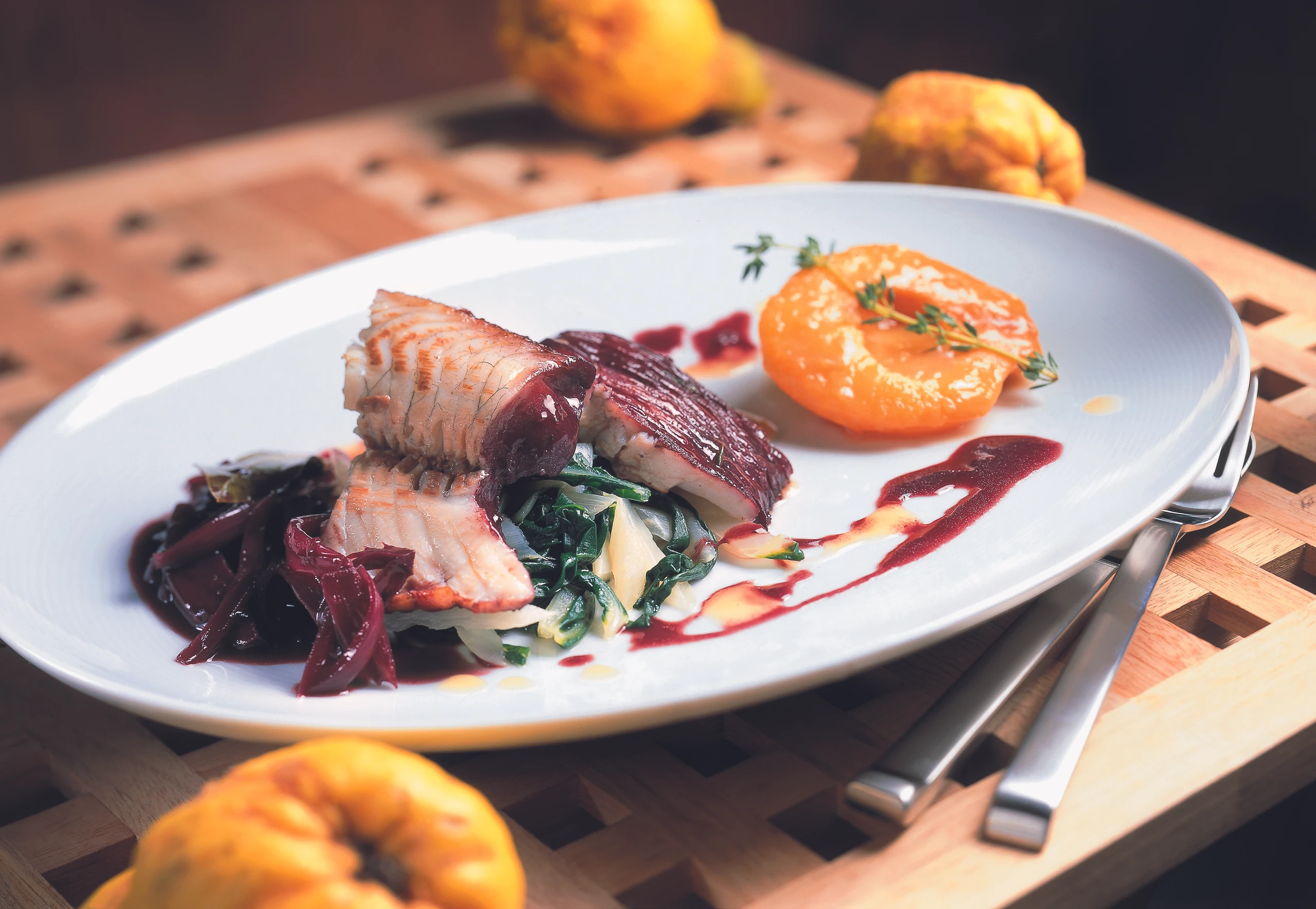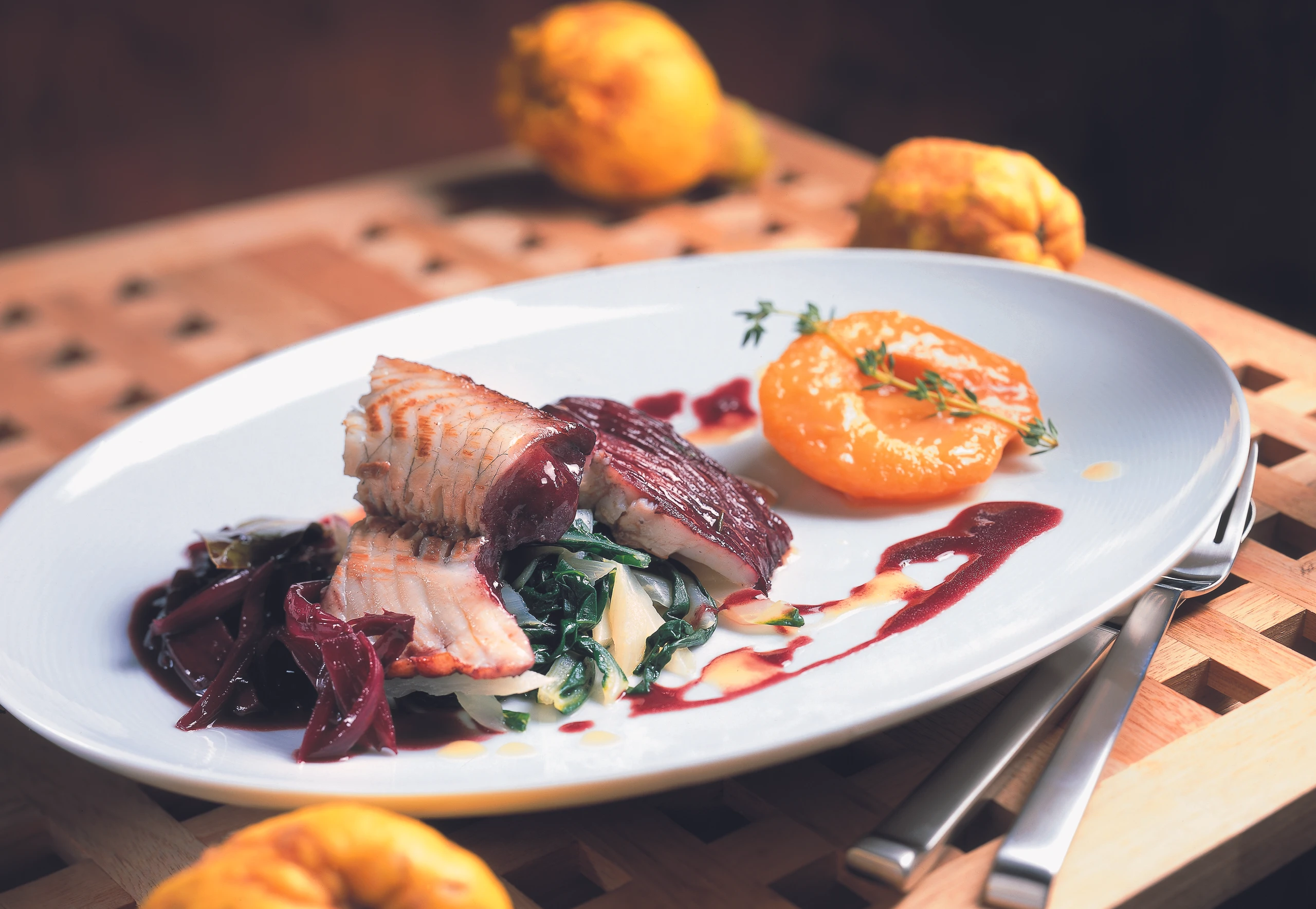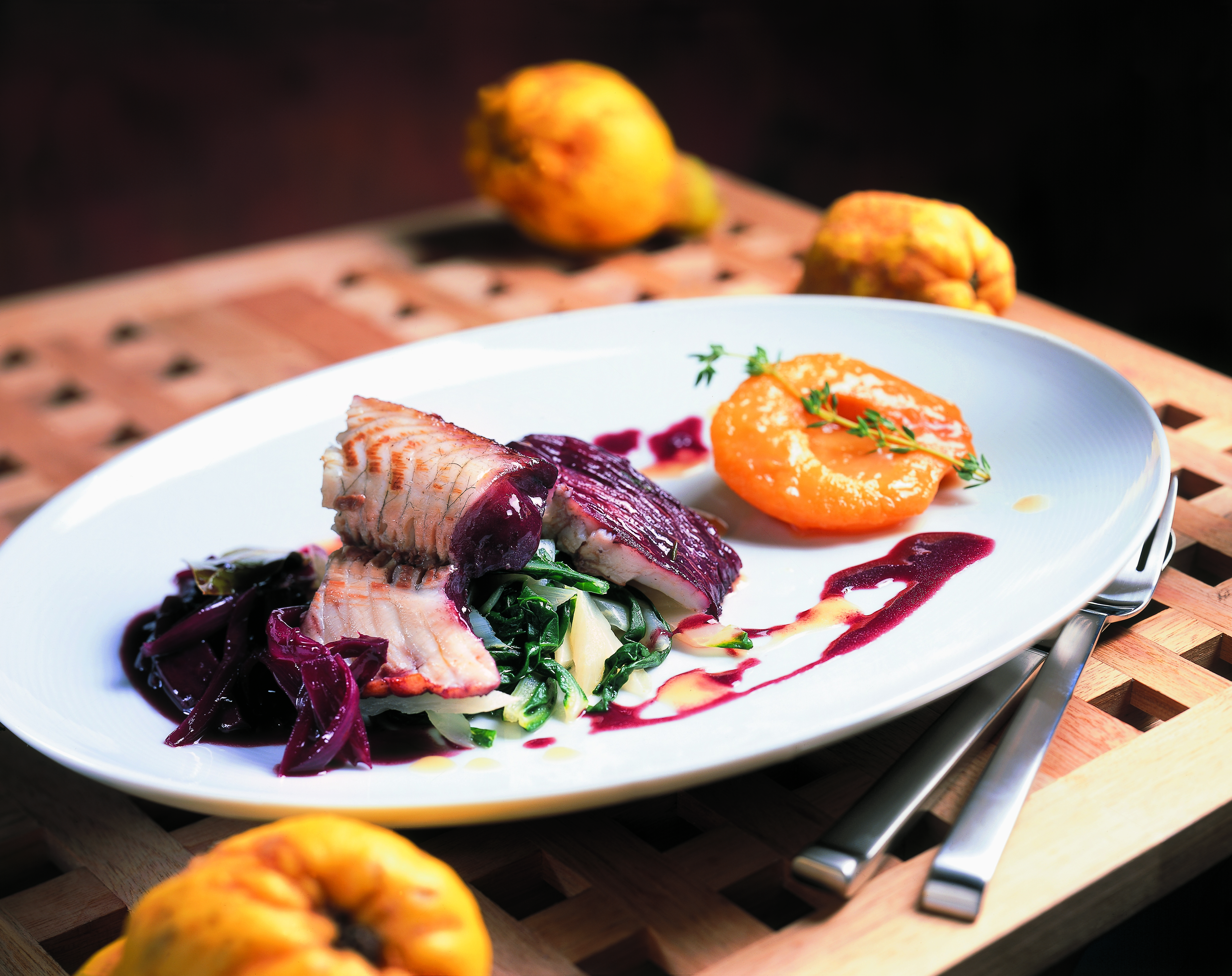 Karpfenfilet in Rotwein geschmort mit Quitten und Mangoldgemüse