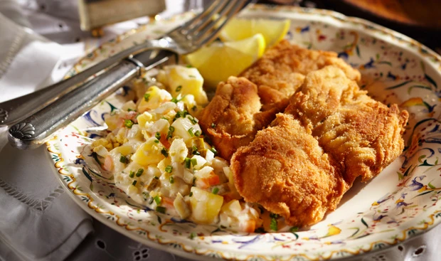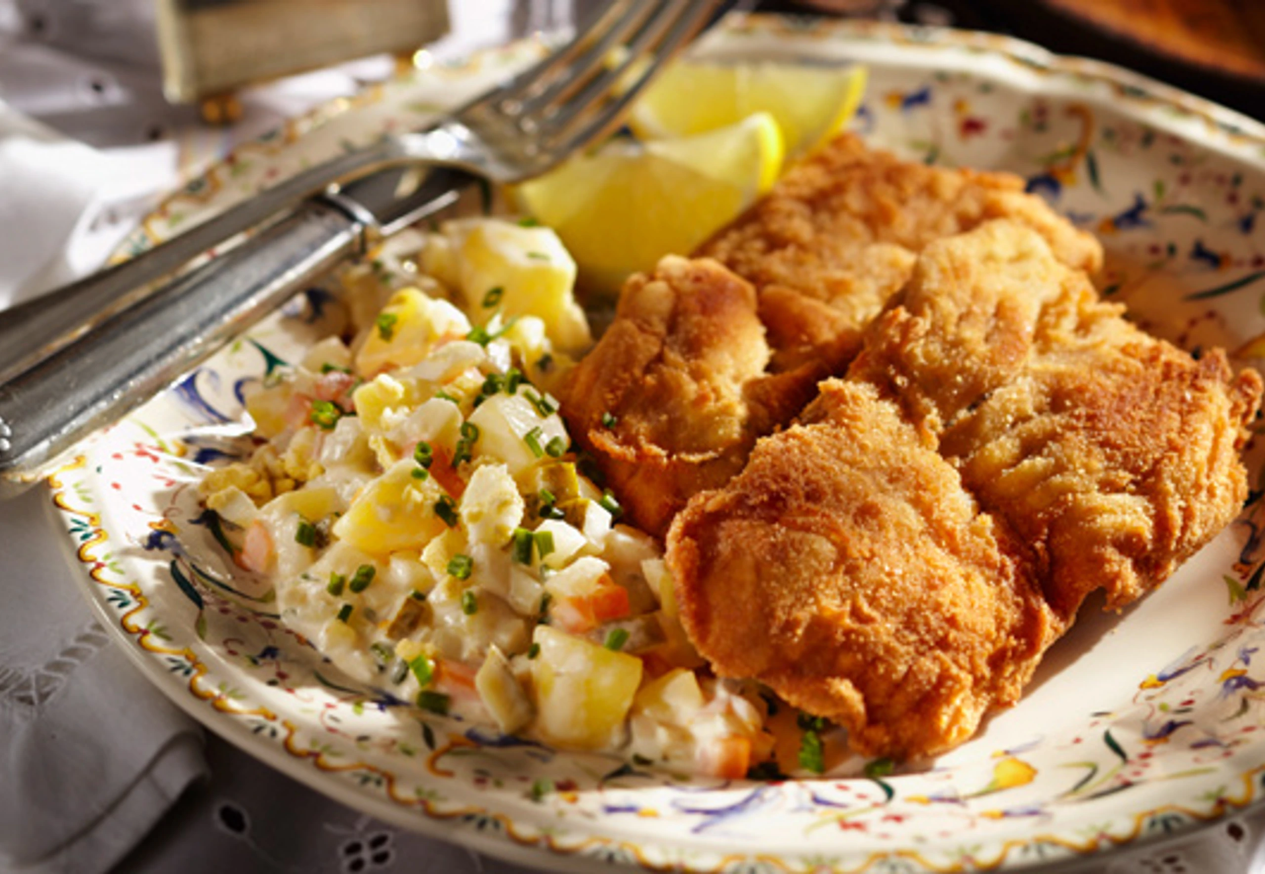 Karpfenfilet vierteln, salzen, in Mehl, 2 Eiern (verquirlt) und Bröseln panieren. 2 Finger hoch Öl erhitzen, Filets darin beidseitig goldgelb backen. Herausheben, auf Küchenpapier abtropfen lassen, mit Zitronenspalten garnieren und mit dem Salat servieren.