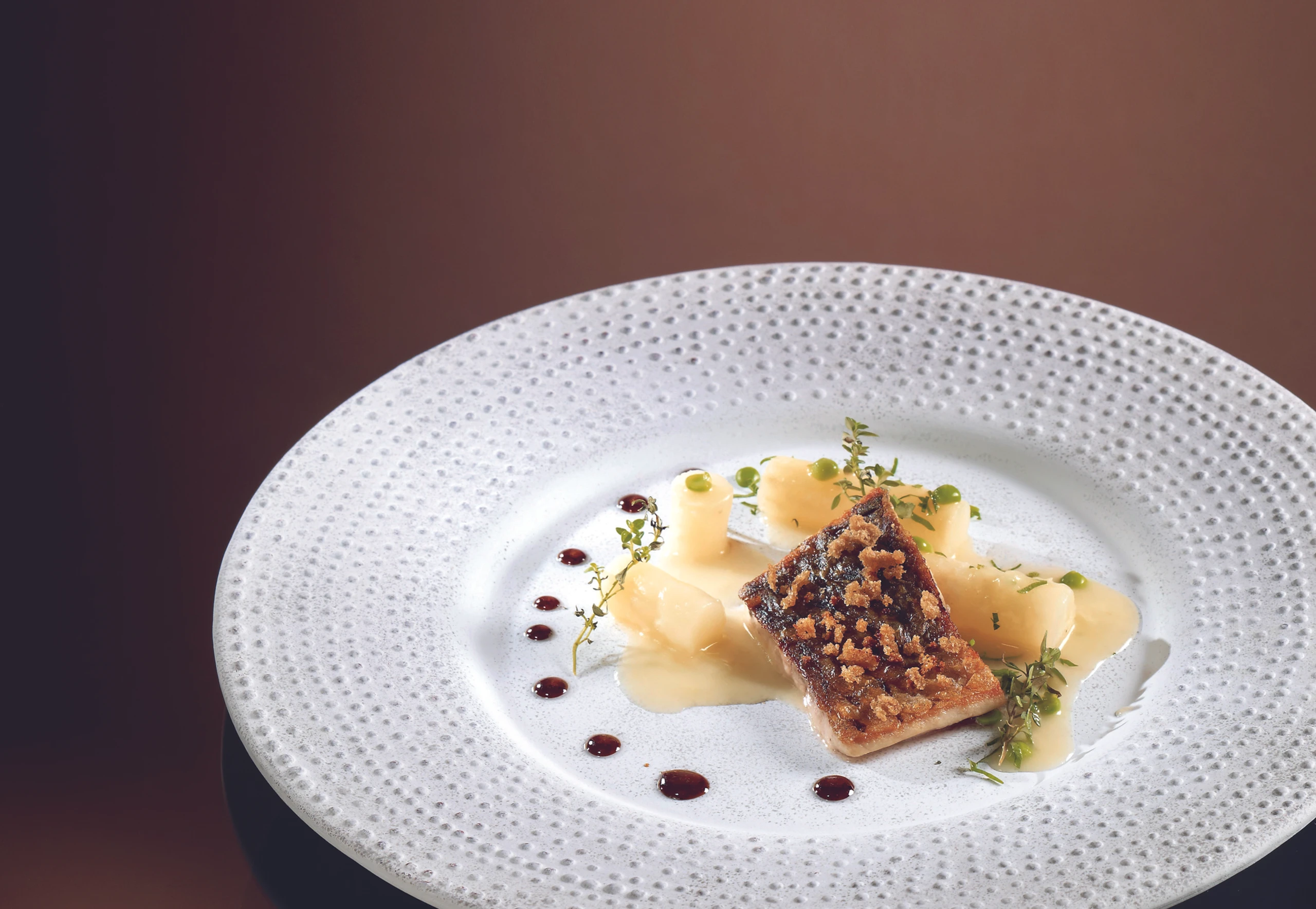 Karpfenfilets mit dem Sellerie-Erbsengemüse anrichten, mit Brotstücken bestreuen und mit Kaffee-Öl garniert servieren.