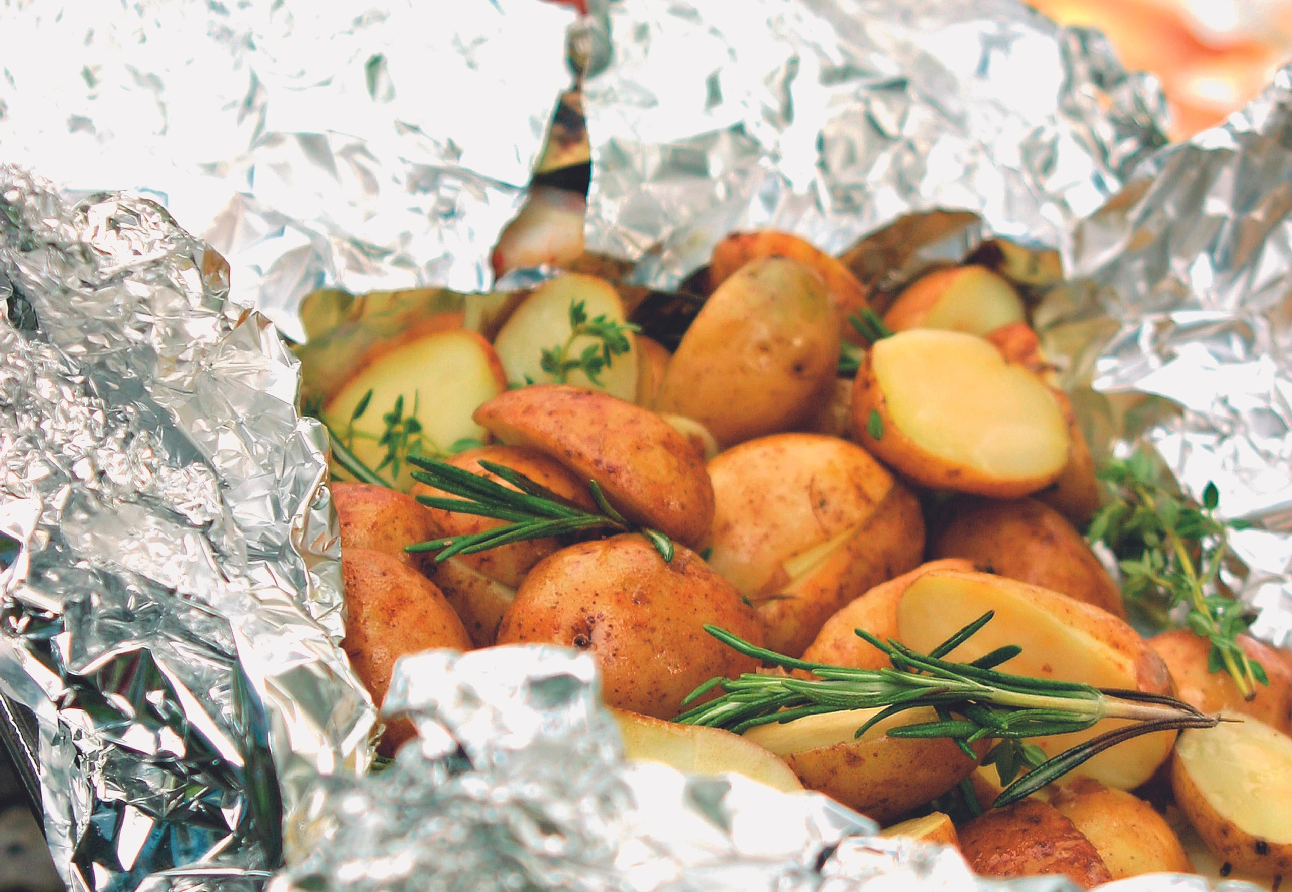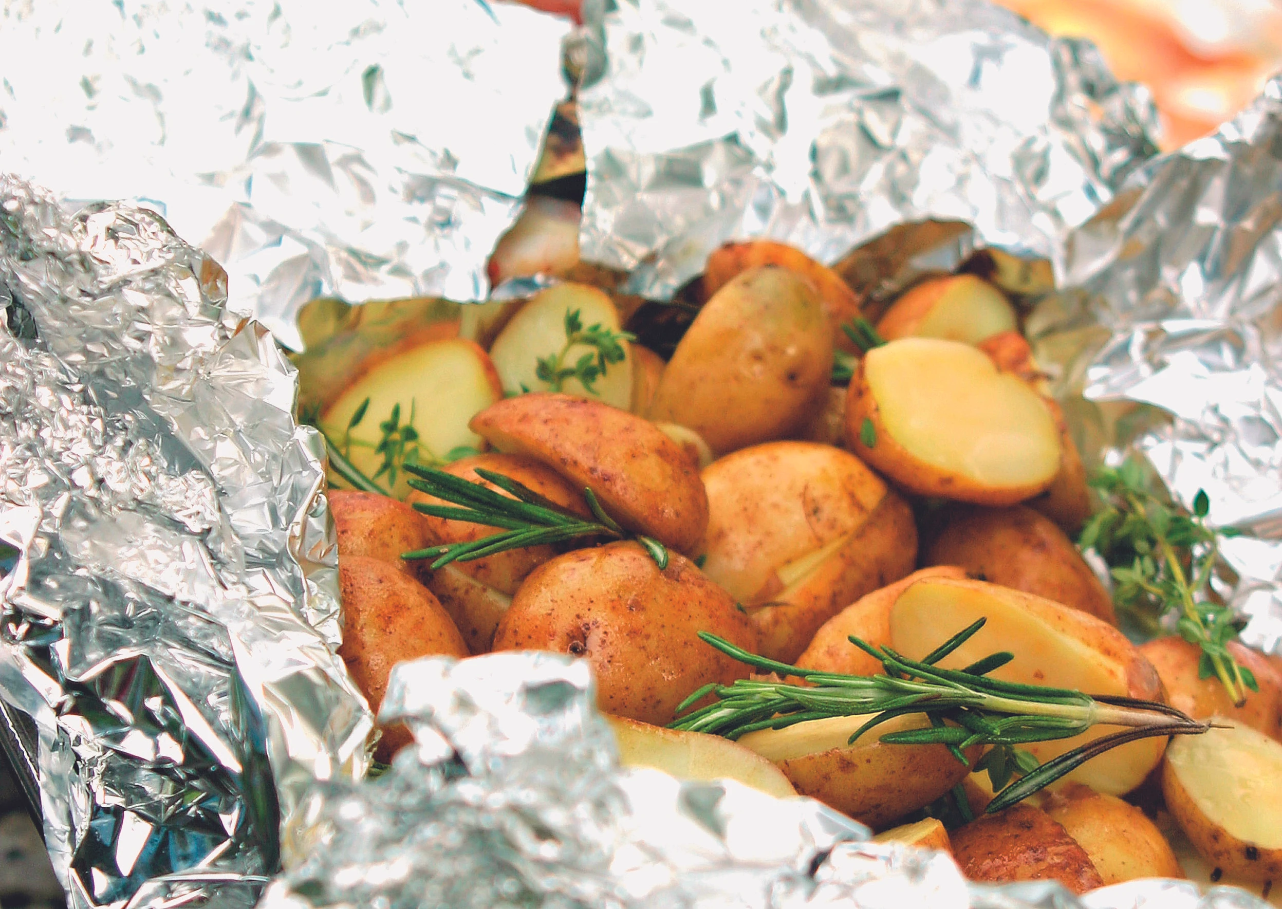Erdäpfel auf Alufolie legen, Knoblauch, Thymian, Rosmarin und Salz darüber streuen, mit Öl beträufeln, in der Folie einschlagen und für ca. 30 Minuten an den Rand des Grillrostes legen.