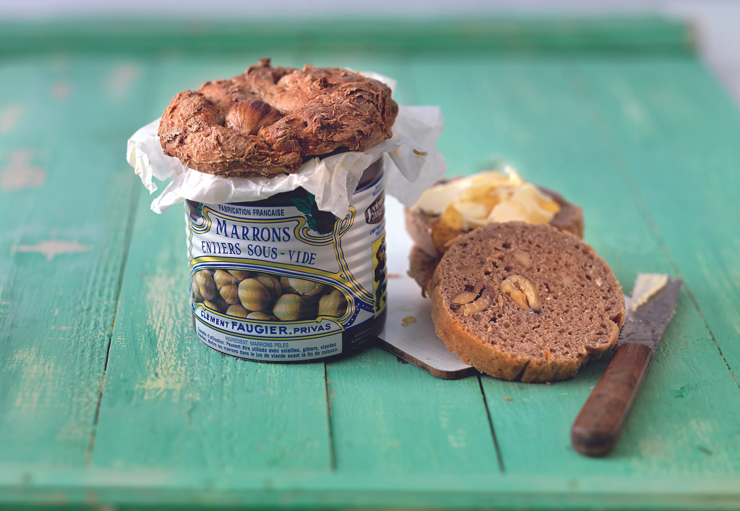 Maroni behutsam in den Teig kneten, Teig achteln. 8 Dosen (Inhalt ca. 300 ml) mit passend zugeschnittenem Backpapier auslegen, Papier mit Butter bestreichen. Teig in die Dosen füllen, mit einem leicht bemehlten Küchentuch abdecken und ca. 30 Minuten aufgehen lassen.