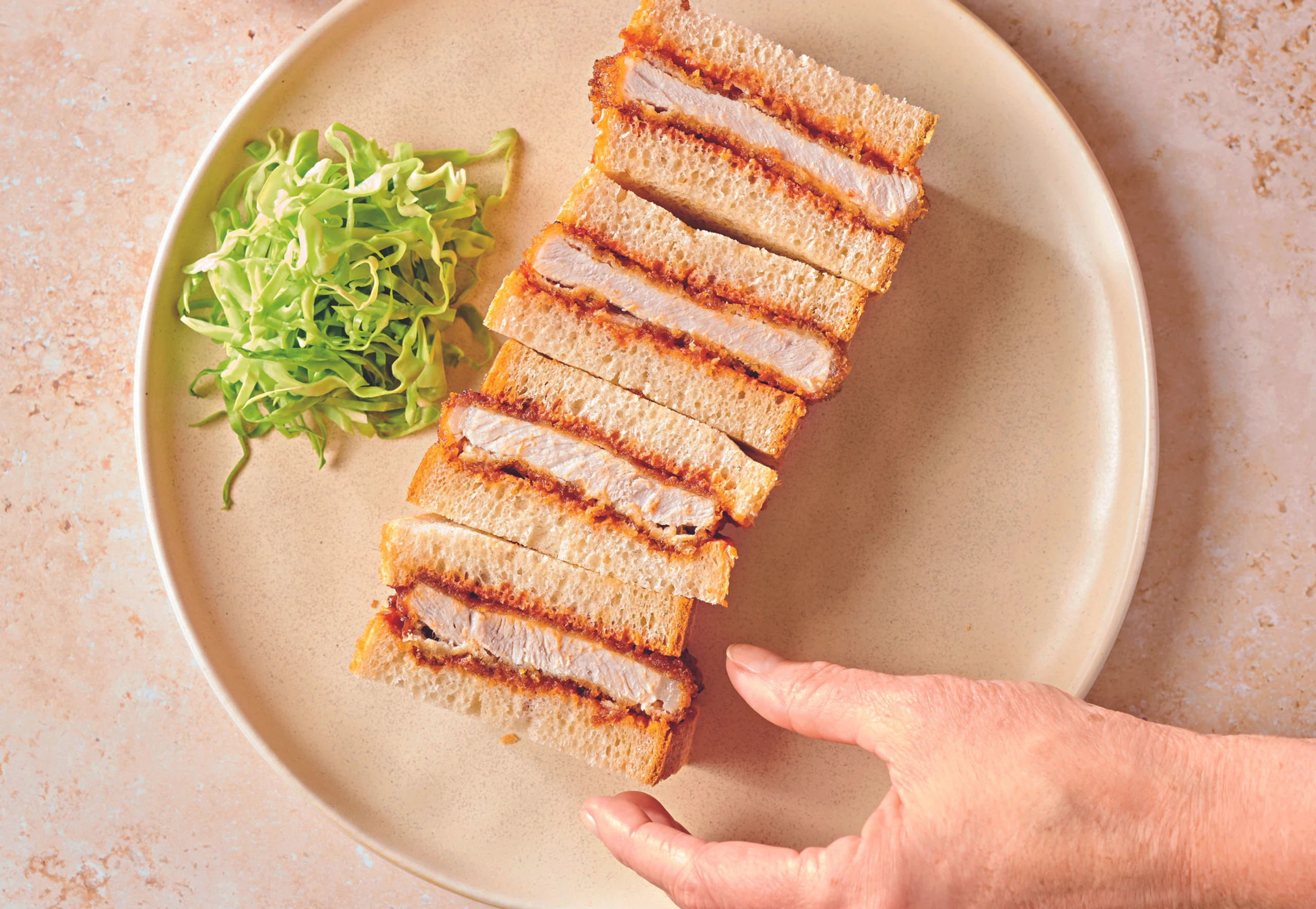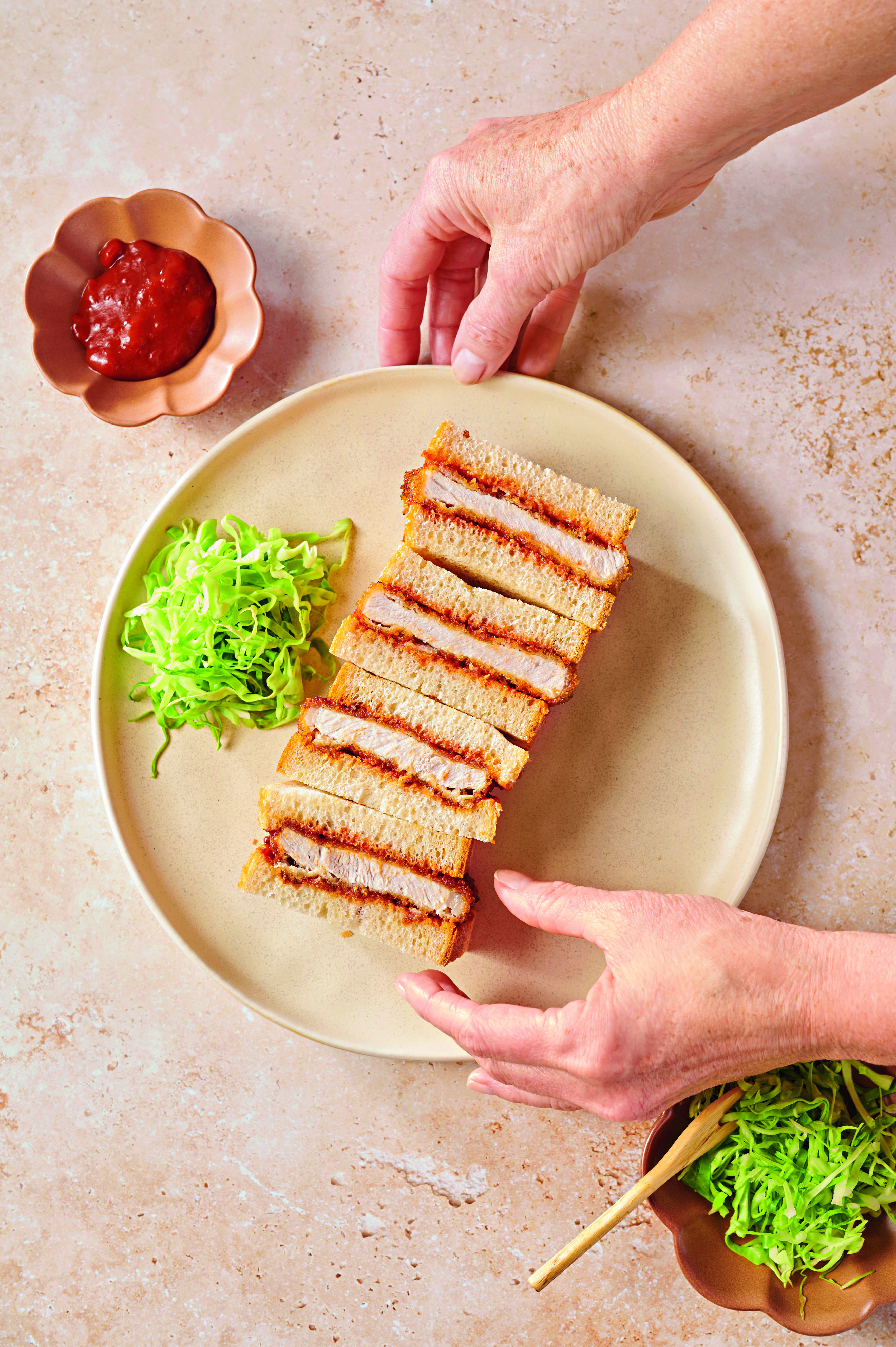 Kraut sehr fein schneiden. Brotscheiben mit der Sauce bestreichen. Koteletts zwischen 2 Brote legen, mit der übrigen Sauce und dem Kraut servieren.