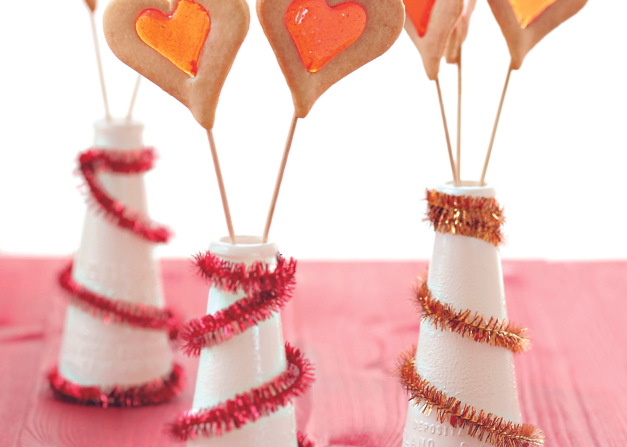 Teig ausrollen, Herzen ausstechen. Holzspieße in Eiklar tauchen, unter die Herzen schieben. Lollis bei 180°C hell backen.