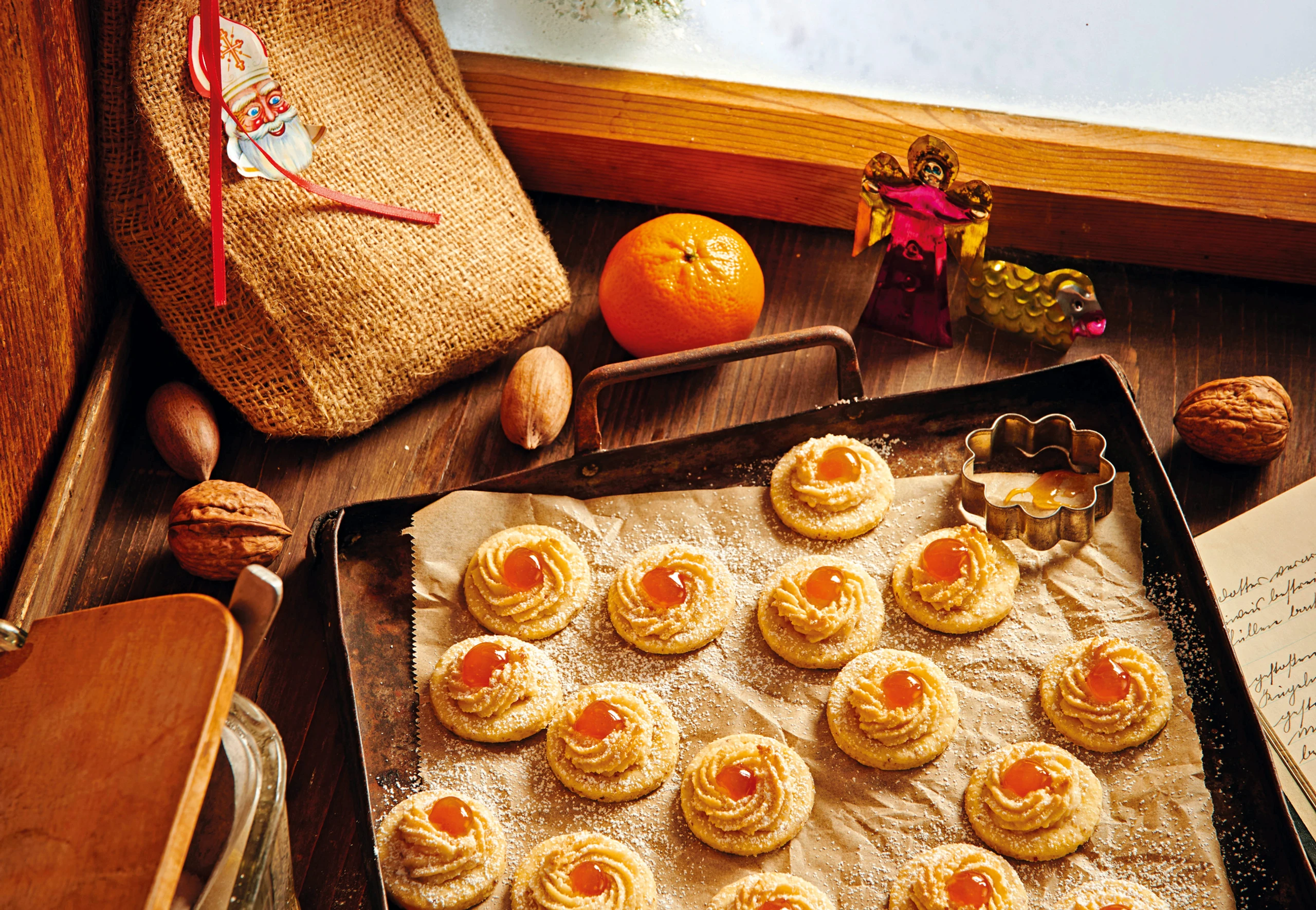 Marmelade aufkochen und in die Marzipankränze füllen. Kekse mit Staubzucker bestreuen.