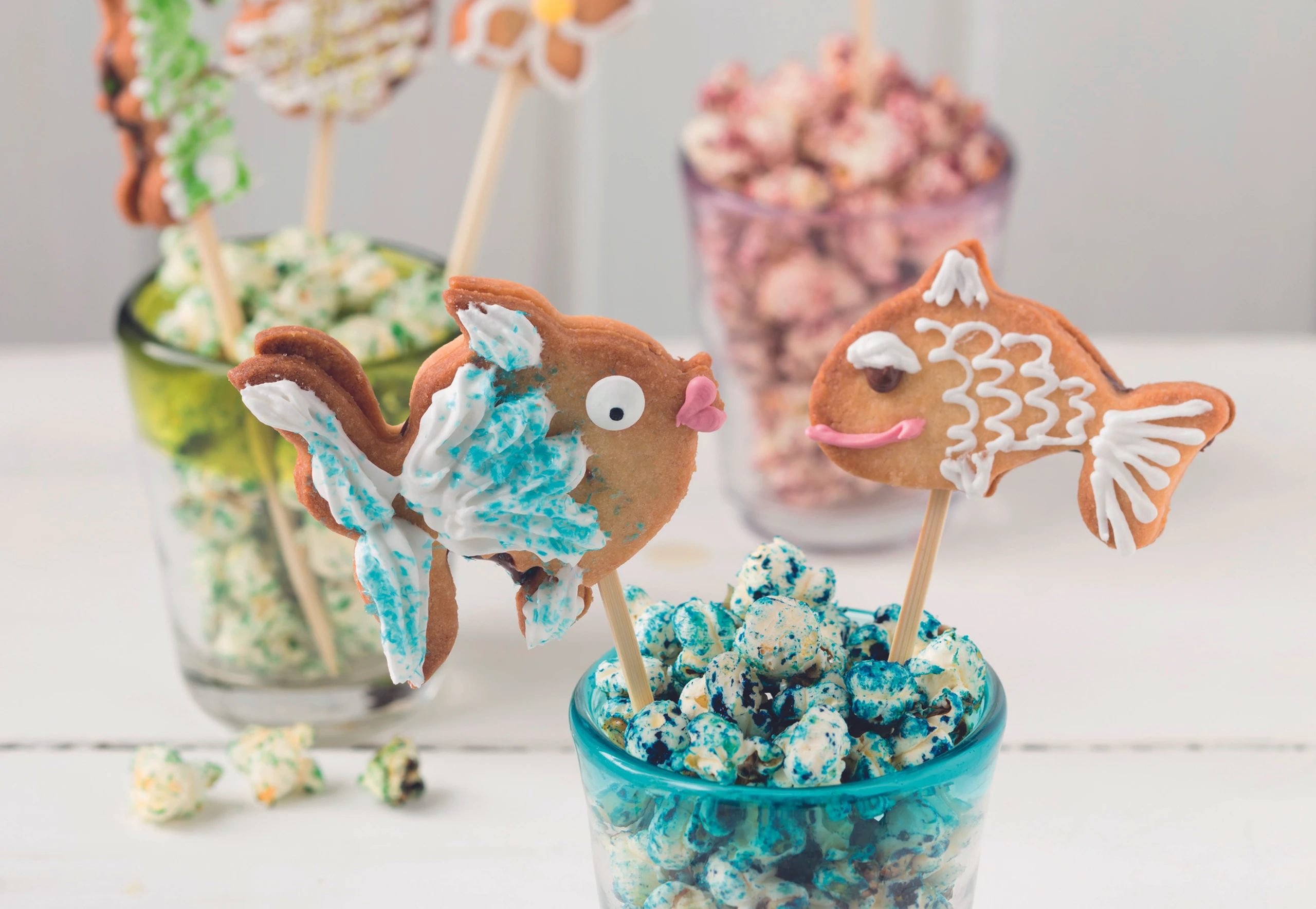 - Die Hälfte der Kekse umdrehen, mit Haselnusscreme bestreichen und Spieße hineindrücken. Spiegelverkehrt ausgestochene Kekse darauf setzen, zusammendrücken und für ca. 1 Stunde kühl stellen. Je 1 EL Öl und Mais mit einer Lebensmittelfarbe mischen und in einem Topf zugedeckt aufpoppen lassen; dabei den Topf rütteln. Popcorn mit wenig Zucker bestreuen, karamellisieren lassen und in Gläser füllen.