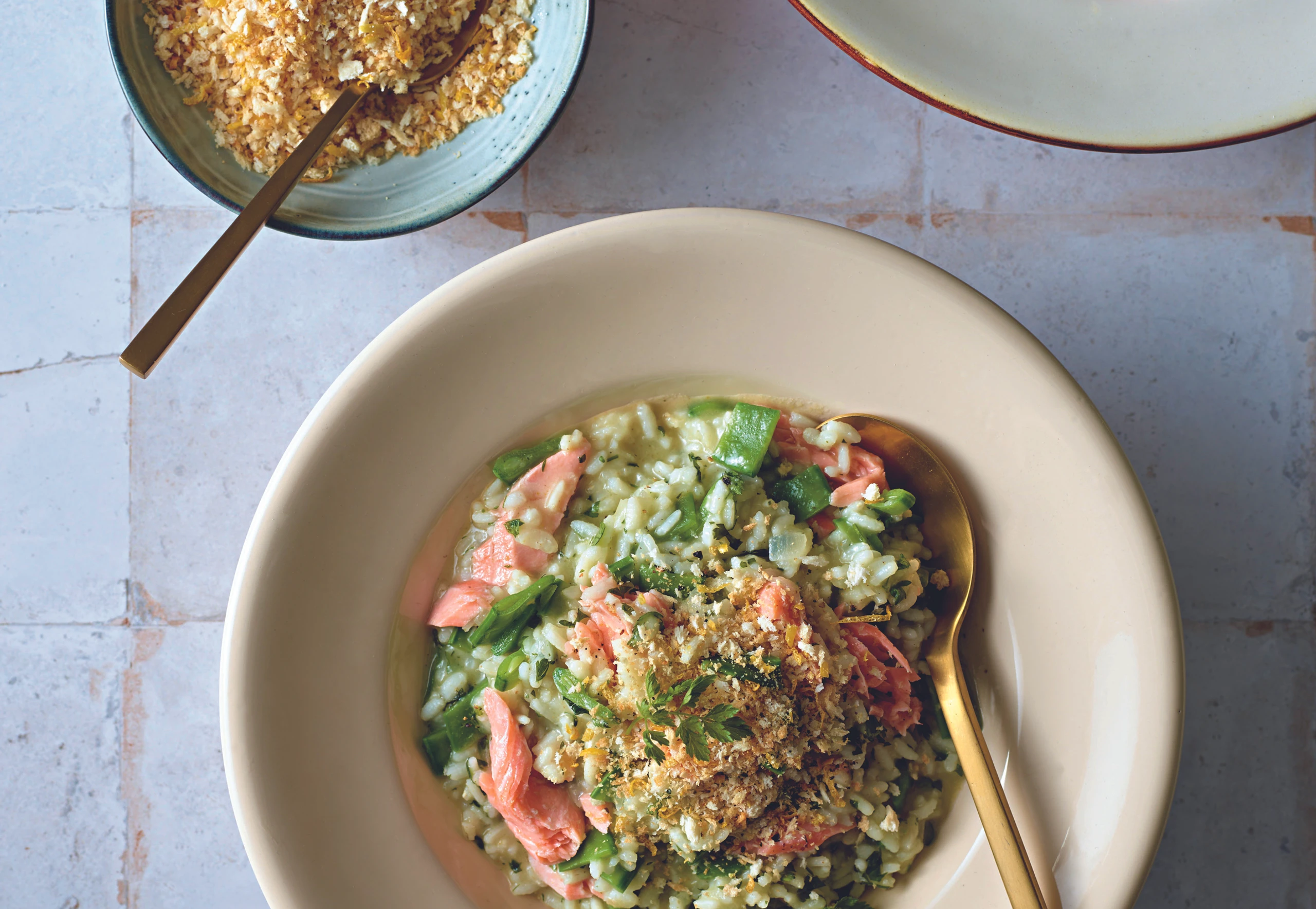 Kerbelrisotto mit Pulled Lachsforelle und Zitronenbröseln