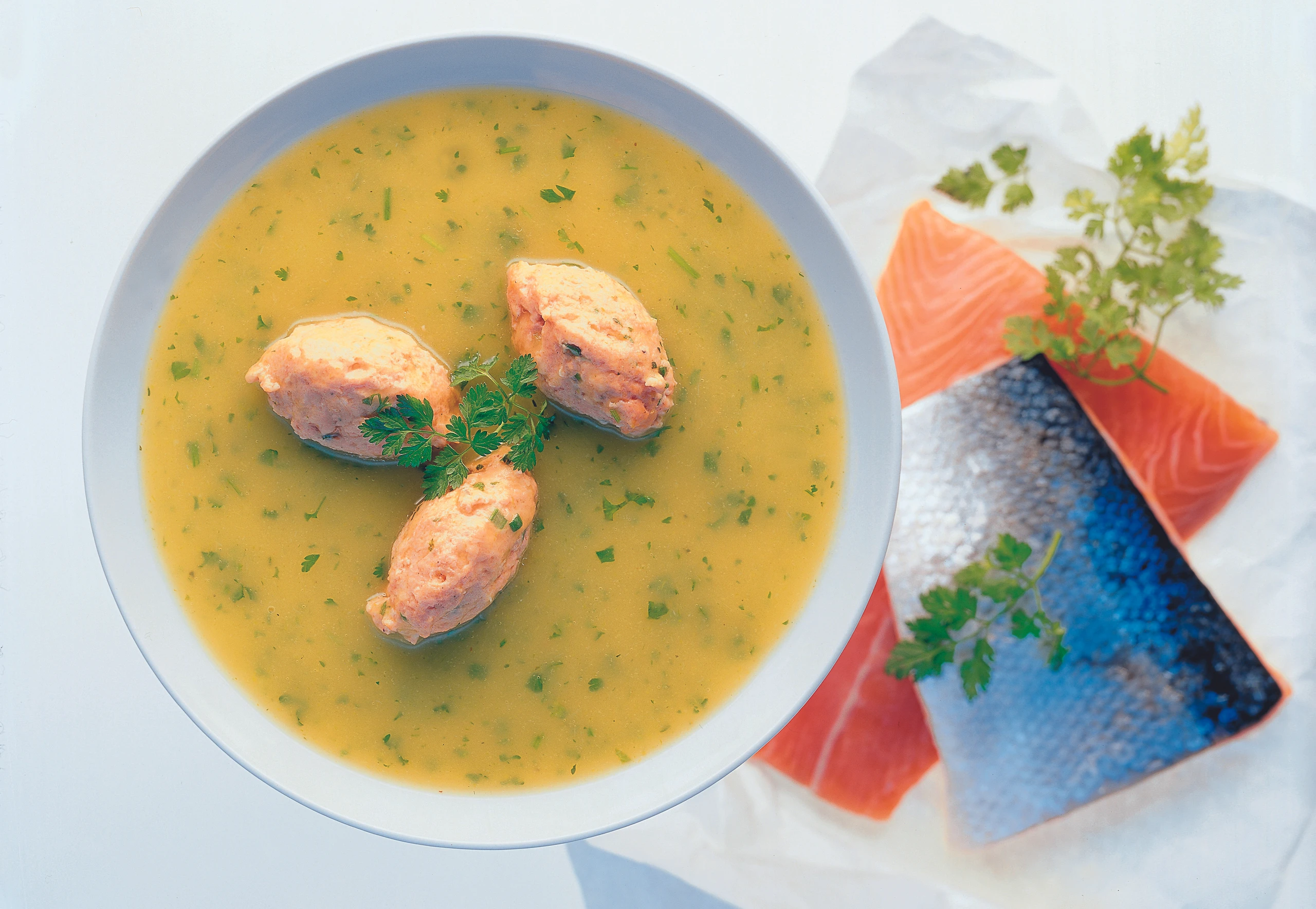 Kurz vor dem Servieren die Suppe nochmals erhitzen, vom Herd nehmen. Kerbel unterrühren. Die Suppe mit Lachsnockerln anrichten.