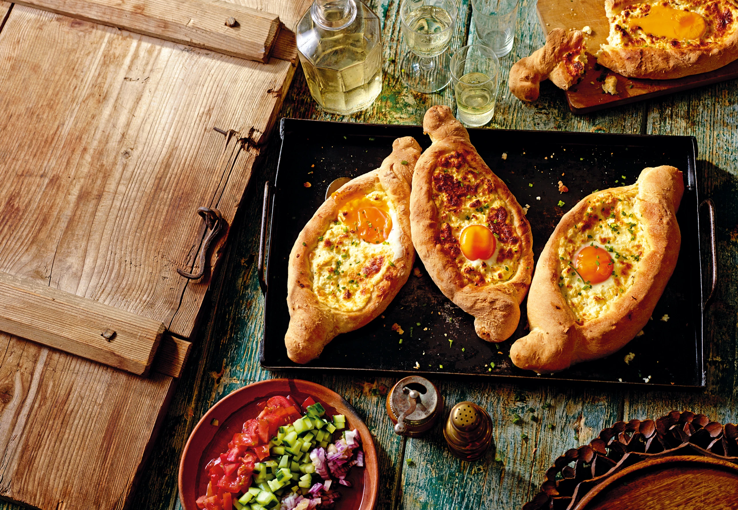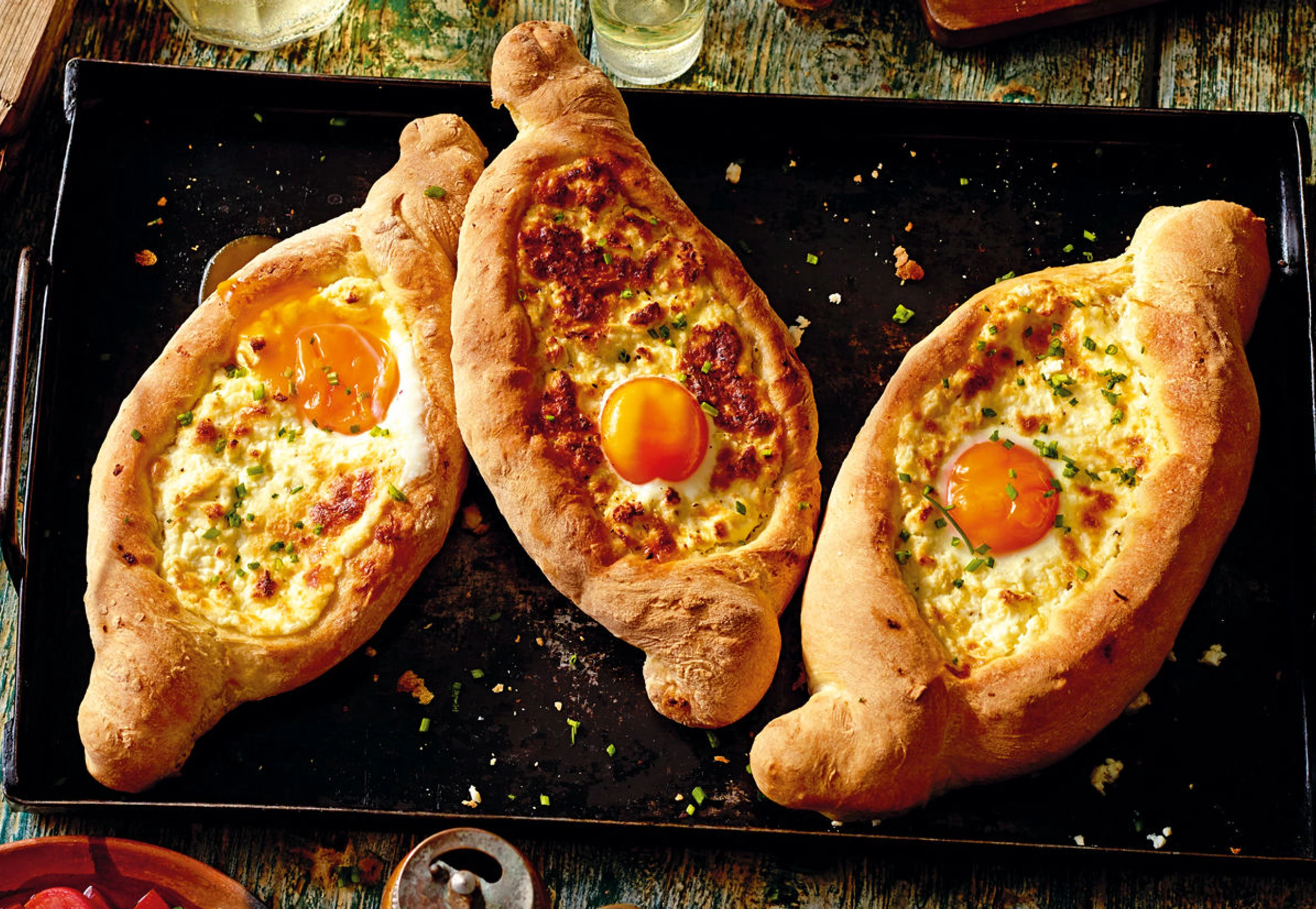 Teigränder mit verquirltem Ei bestreichen. Khachapuri im Rohr ca. 30 Minuten goldbraun backen. Herausnehmen, Dotter vorsichtig darauf geben und 1 Minute backen. Khachapuri mit Schnittlauch bestreut servieren. Dazu passt Salat.