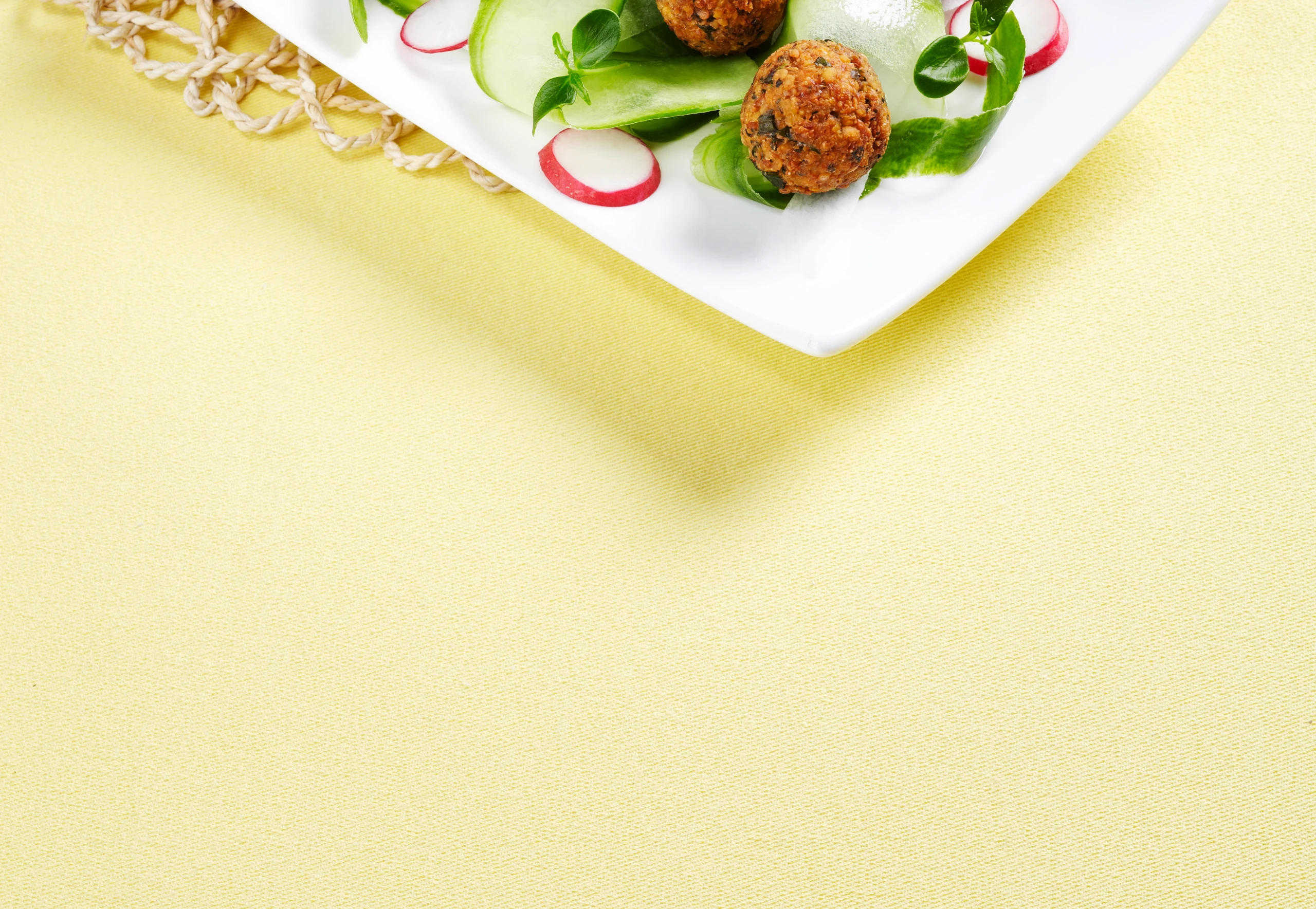 - Kichererbsen-Bällchen mit dem Gurken-Salat anrichten und mit dem Dip servieren.