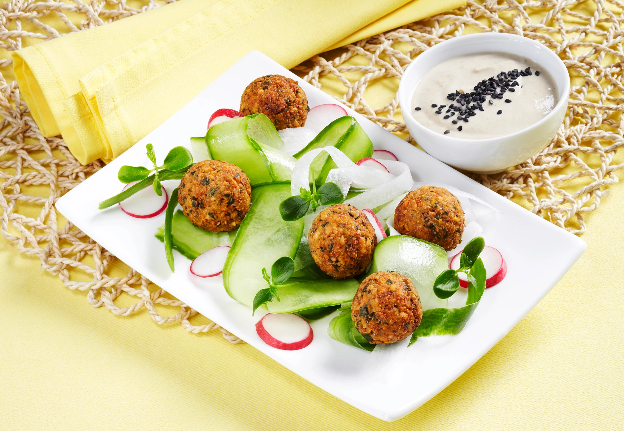 - Kichererbsen-Bällchen mit dem Gurken-Salat anrichten und mit dem Dip servieren.