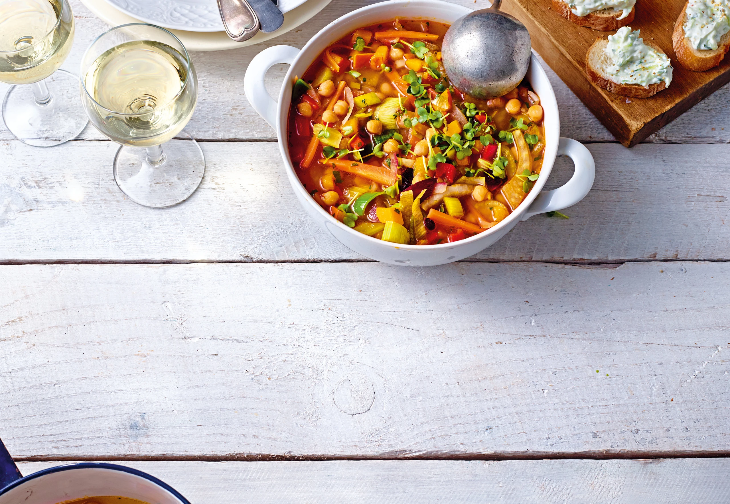 Kresseblättchen abschneiden. Lorbeerblatt aus dem Eintopf entfernen. Eintopf mit Salz und Pfeffer abschmecken, anrichten und mit Kresse bestreuen. Eintopf mit Baguette und Gurkencreme servieren.