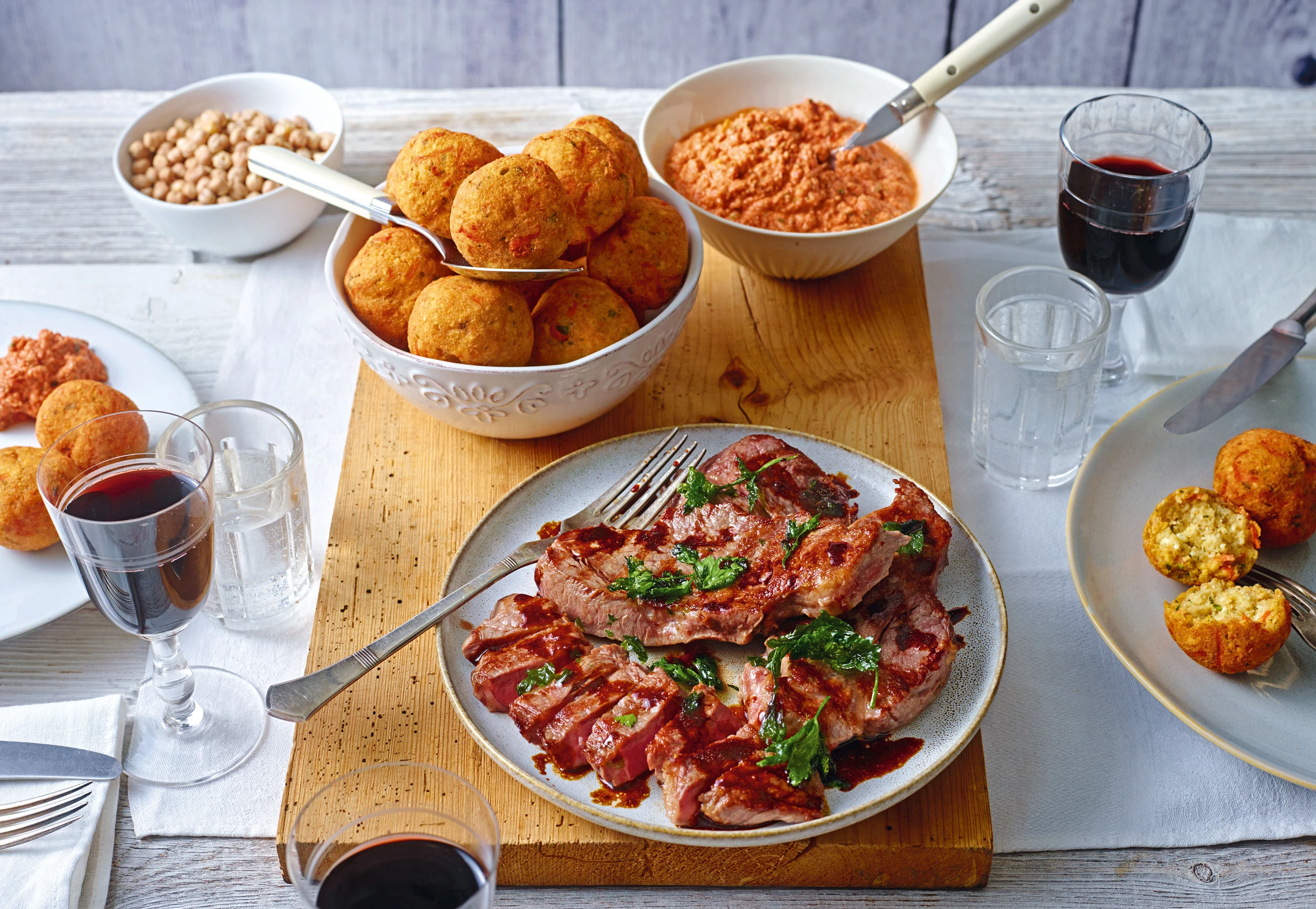 Kichererbsen-Karottenbällchen mit Fetafülle, Beiried und rotem Pesto