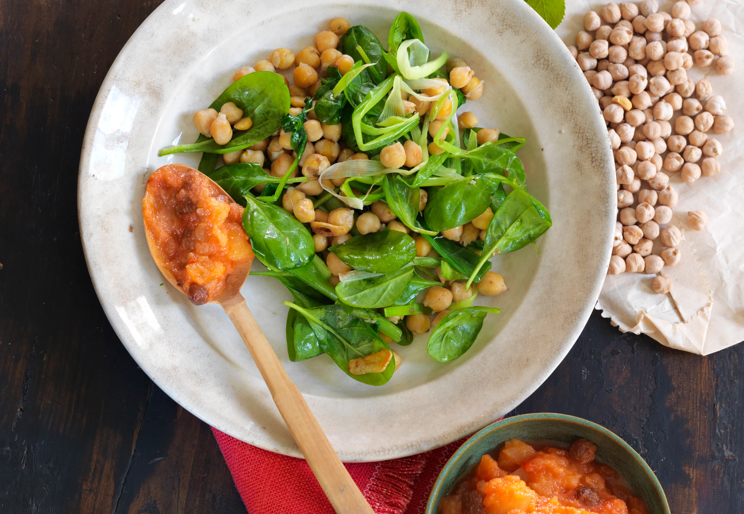 Knoblauch in 3 EL Öl kurz braten. Kichererbsen, Kreuzkümmel und 1 Prise Muskat zugeben, ca. 3 Minuten braten. Jungzwiebeln zugeben, kurz braten. Spinat untermischen. Gemüse mit Zitronensaft, Salz und Pfeffer abschmecken und mit dem Chutney servieren.
