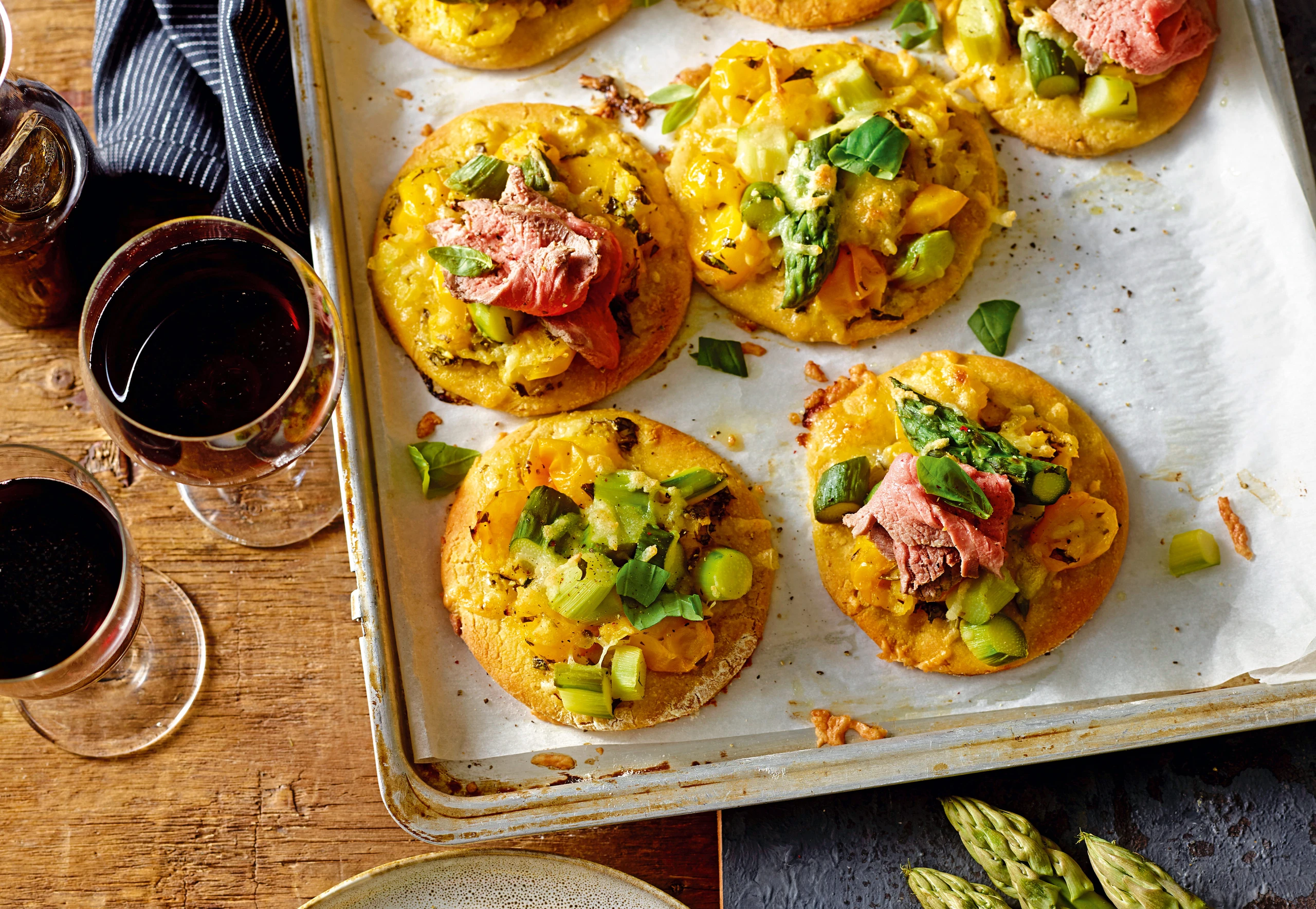 Kichererbsen-Pizza mit gelben Paradeisern, Spargel und Roastbeef