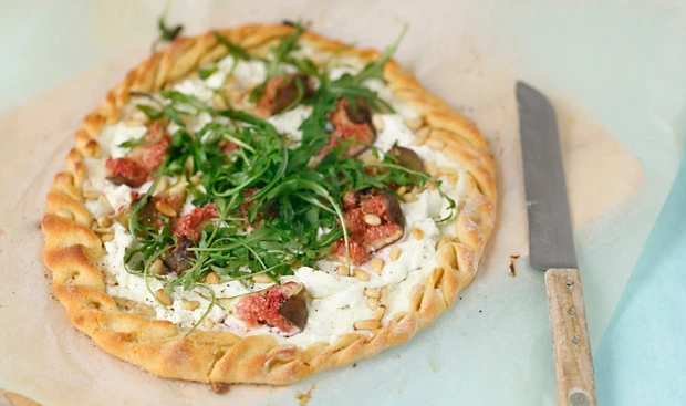 Ricotta mit Parmesan und Zitronenschale verrühren und auf dem Teig verteilen. Feigen in Spalten schneiden und auf den Pizzen verteilen. Ziegenkäse darüber bröseln, mit Pinienkernen bestreuen, salzen und pfeffern.