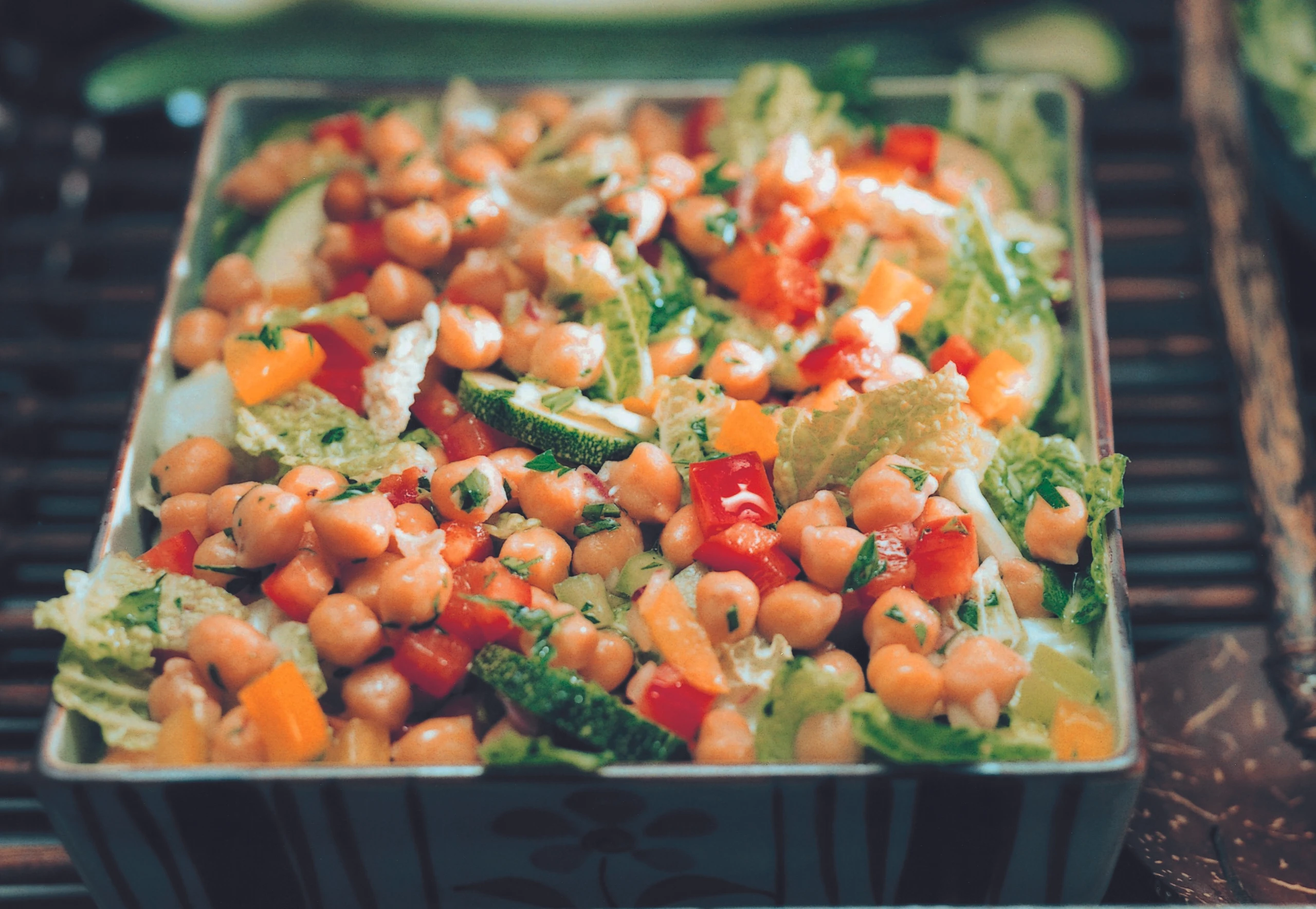 Für die Marinade Zwiebel schälen und klein würfelig schneiden. Zwiebel mit Essig, Suppe, Kräutern sowie Salz, Pfeffer und zerdrücktem Knoblauch gut verrühren. Öl unter Rühren zugießen. Zuerst Kichererbsen, dann das Gemüse untermischen. Salat vor dem Servieren ca. 2 Stunden ziehen lassen.