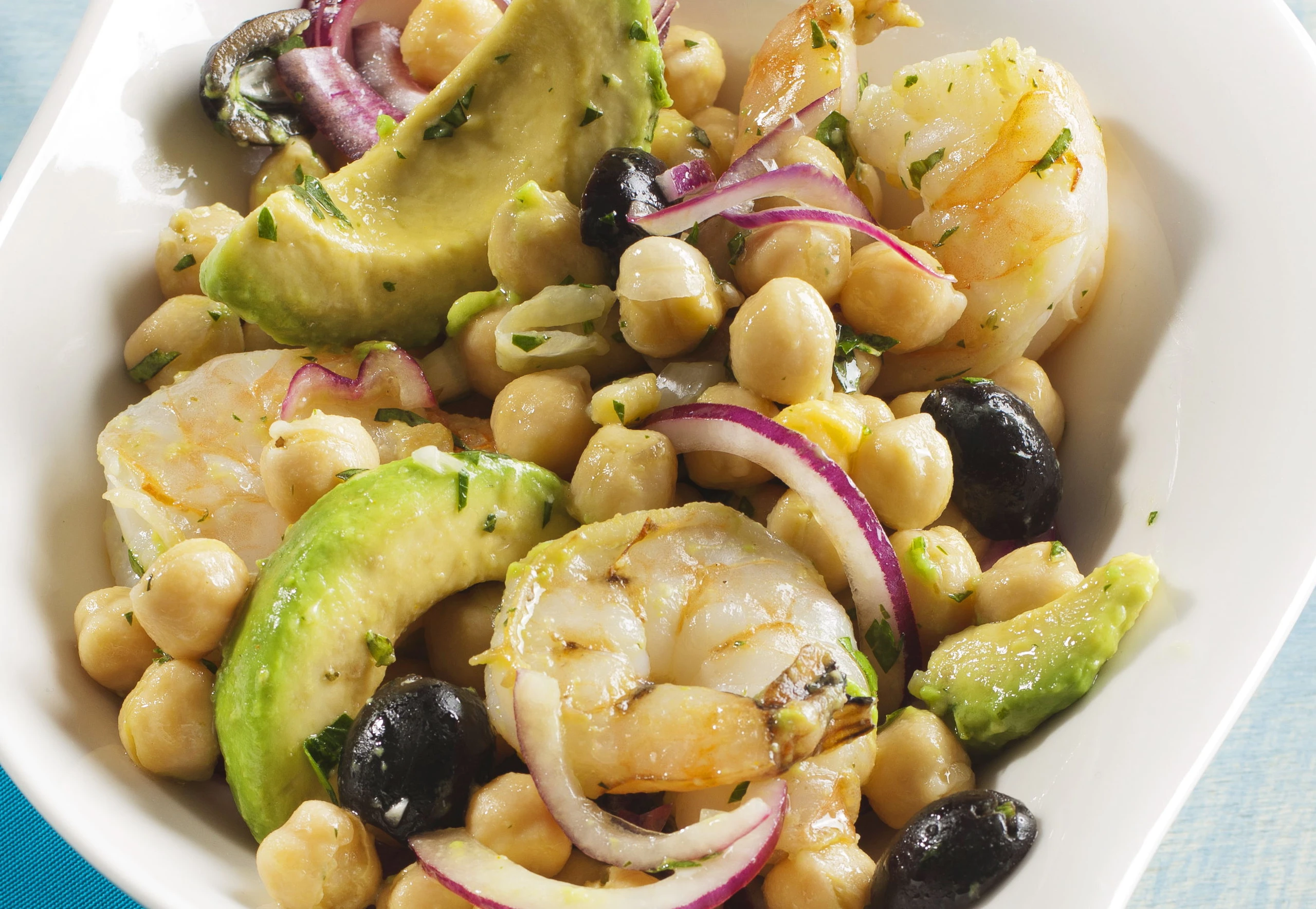 Für die Marinade Zitronensaft mit Salz, Pfeffer, zerdrücktem Knoblauch und Basilikum vermischen. Öl einrühren. Garnelen, Avocado, Zwiebel, Oliven und Kichererbsen mit der Marinade vermischen und kurz ziehen lassen.