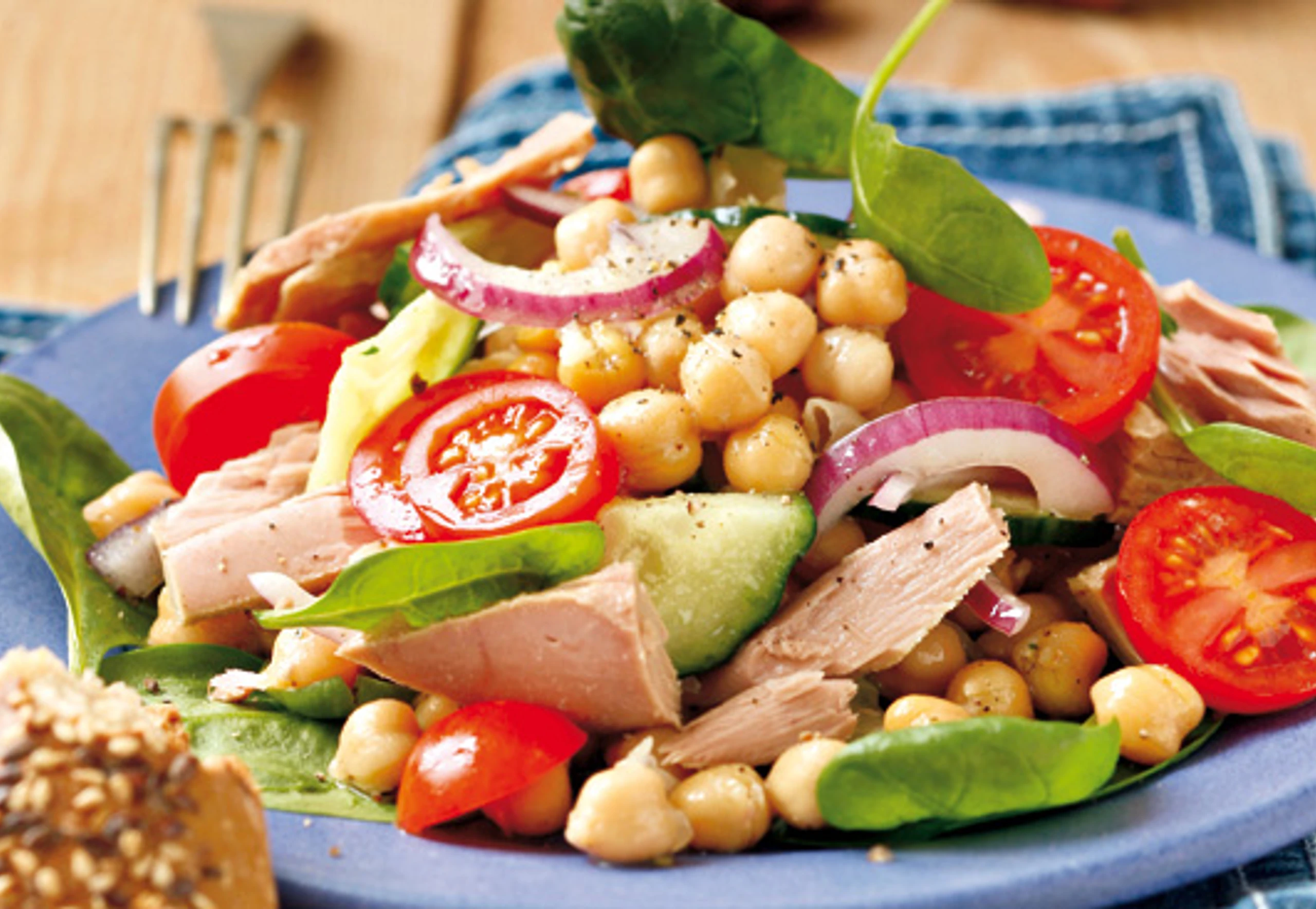 - Für die Marinade Essig salzen, pfeffern und mit dem Öl verrühren. Kichererbsen, Zwiebeln, Gurke, Paradeiser und Thunfisch behutsam mit der Marinade vermischen. Salat anrichten und mit Spinatblättern garnieren.